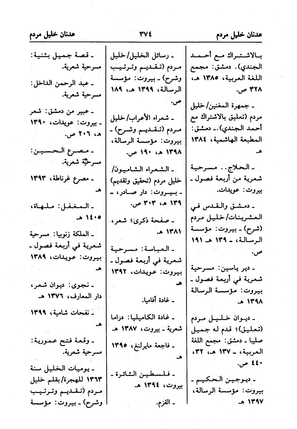 - ديوان خليل مردم (تعليق)؛ قدم له جميل صليبا - دمشق: مجمع اللغة العربية، - 137 هـ، 32، 440 ص.