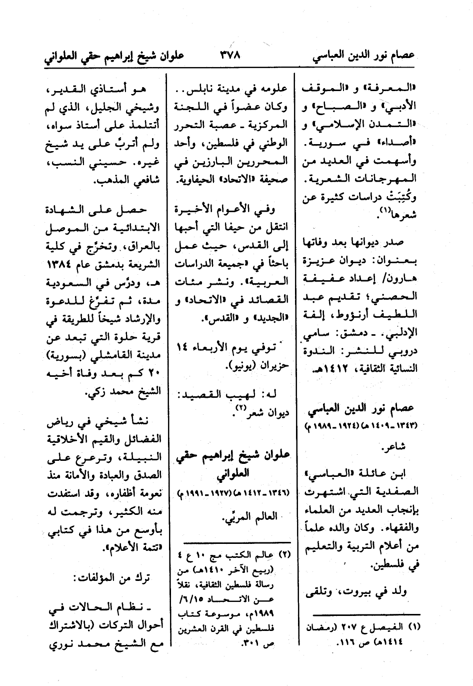 (¬2) عالم الكتب مج 10 ع 4 (ربيع الآخر 1410 هـ) من رسالة فلسطين الثقافية، نقلاً عن الاتحاد 15/ 6/1989 م، موسوعة كتاب فلسطين في القرن العشرين ص 301.