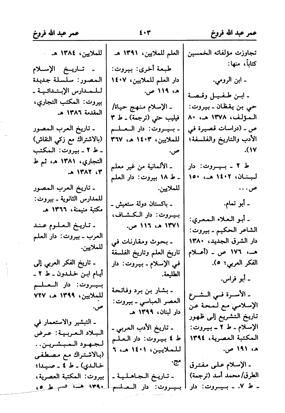 - تاريخ الأدب العربي - ط 4 بيروت: دار العلم للملايين، 1401 هـ، 6 مج.