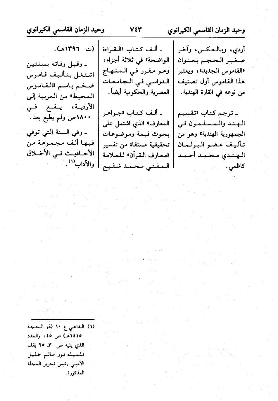 (¬1) الداعي ع 10 (ذو الحجة 1415 هـ) ص 45، والعدد الذي يليه ص 3 - 25 بقلم تلميذه نور عالم خليل الأميني رئيس تحرير المجلة المذكورة.