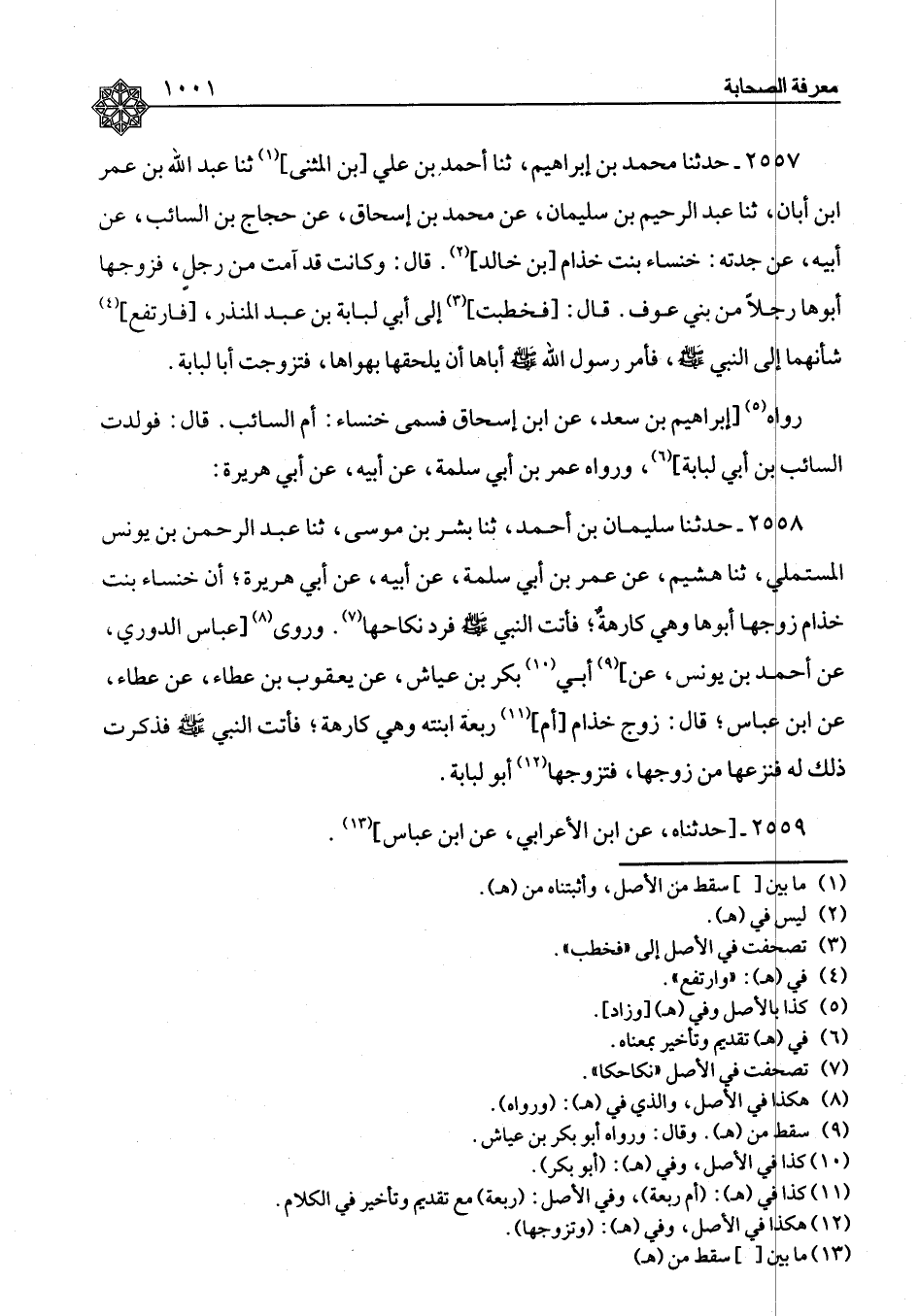٢٥٥٧ - حَدَّثَنَا مُحَمَّدُ بْنُ إِبْرَاهِيمَ، ثنا أَحْمَدُ بْنُ عَلِيِّ بْنِ الْمُثَنَّى، ثنا عَبْدُ اللهِ بنُ عُمَرَ بْنِ أَبَانَ، ثنا عَبْدُ الرَّحِيمِ بْنُ سُلَيْمَانَ، عَنْ مُحَمَّدِ بْنِ إِسْحَاقَ، عَنْ حَجَّاجِ بْنِ السَّائِبِ، عَنْ أَبِيهِ، عَنْ جَدَّتِهِ خَنْسَاءَ بِنْتِ خِذَامِ بْنِ خَالِدٍ قَالَ: " وَكَانَتْ قَدْ آمَتْ مِنْ رَجُلٍ، فَزَوَّجَهَا أَبُوهَا رَجُلًا مِنْ بَنِي عَوْفٍ قَالَ: فَخُطِبَتْ إِلَى أَبُو لُبَابَةَ بْنِ عَبْدِ الْمُنْذِرِ، فَارْتَفَعَ شَأْنُهُمَا إِلَى النَّبِيِّ صَلَّى اللَّهُ عَلَيْهِ وَسَلَّمَ، فَأَمَرَ رَسُولُ اللهِ صَلَّى اللَّهُ عَلَيْهِ وَسَلَّمَ أَبَاهَا أَنْ يُلْحِقَهَا بِهَوَاهَا فَتَزَوَّجَتْ أَبَا لُبَابَةَ " رَوَاهُ إِبْرَاهِيمُ بْنُ سَعْدٍ، عَنِ ابْنِ إِسْحَاقَ فَسَمَّى خَنْسَاءَ أُمَّ السَّائِبِ قَالَ: فَوَلَدَتِ السَّائِبَ بْنَ أَبِي لُبَابَةَ وَرَوَاهُ عُمَرُ بْنُ أَبِي سَلَمَةَ، عَنْ أَبِيهِ، عَنْ أَبِي هُرَيْرَةَ
