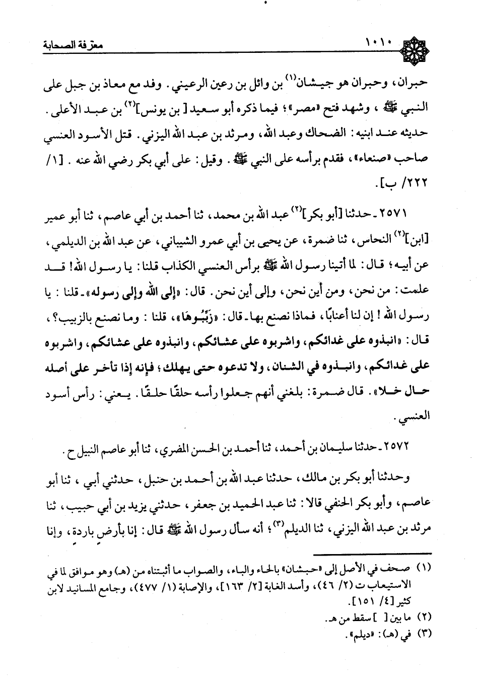٢٥٧١ - حَدَّثَنَا أَبُو بَكْرٍ عَبْدُ اللهِ بْنُ مُحَمَّدٍ، ثنا أَحْمَدُ بْنُ أَبِي عَاصِمٍ، ثنا أَبُو عُمَيْرِ بْنُ النَّحَّاسِ، ثنا ضَمْرَةُ، عَنْ يَحْيَى بْنِ أَبِي عَمْرٍو السَّيْبَانِيِّ، عَنْ عَبْدِ اللهِ بْنِ الدَّيْلَمِيِّ، عَنْ أَبِيهِ، قَالَ: لَمَّا أَتَيْنَا رَسُولَ اللهِ صَلَّى اللَّهُ عَلَيْهِ وَسَلَّمَ بِرَأْسِ الْعَنْسِيِّ الْكَذَّابِ قُلْنَا: يَا رَسُولَ اللهِ قَدْ عَلِمْتَ: مَنْ نَحْنُ، وَمِنْ أَيْنَ نَحْنُ، وَإِلَى أَيْنَ نَحْنُ قَالَ: «إِلَى اللهِ وَإِلَى رَسُولِهِ» ، قُلْنَا: يَا رَسُولَ اللهِ إِنَّ لَنَا أَعْنَابًا، فَمَاذَا نَصْنَعُ بِهَا قَالَ: «زَبِّبُوهَا» ، قُلْنَا: وَمَا نَصْنَعُ بِالزَّبِيبِ؟ قَالَ: «انْبِذُوهُ عَلَى غَدَائِكُمْ، وَاشْرَبُوهُ عَلَى عَشَائِكُمْ، وَانْبِذُوهُ عَلَى عَشَائِكُمْ وَاشْرَبُوهُ عَلَى غَدَائِكُمْ، وَانْبِذُوهُ فِي الشِّنَانِ، وَلَا تَدَعُوهُ حَتَّى يَهْلِكَ، فَإِنَّهُ إِذَا تَأَخَّرَ عَلَى أَصْلِهِ حَالَ خَلًّا» قَالَ ضَمْرَةُ: بَلَغَنِي أَنَّهُمْ جَعَلُوا رَأْسَهُ حِلَقًا حِلَقًا يَعْنِي: رَأْسَ أَسْوَدٍ الْعَنْسِيِّ