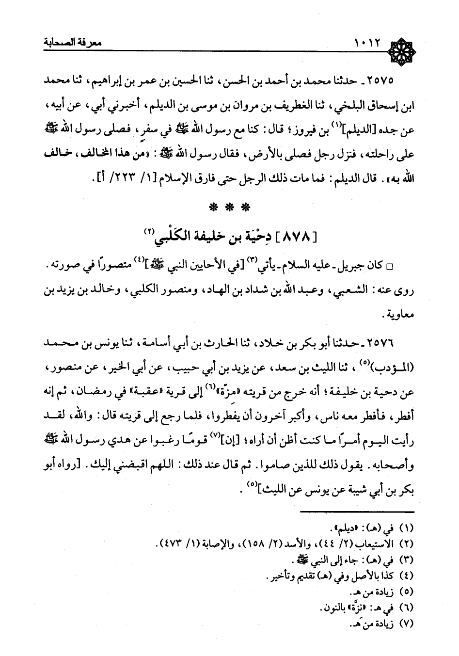 دِحْيَةُ بْنُ خَلِيفَةَ الْكَلْبِيُّ كَانَ جِبْرِيلُ عَلَيْهِ السَّلَامُ، يَأْتِي فِي الْأَحَايِينِ النَّبِيَّ صَلَّى اللَّهُ عَلَيْهِ وَسَلَّمَ مُتَصَوِّرًا فِي صُورَتِهِ رَوَى عَنْهُ: الشَّعْبِيُّ، وَعَبْدُ اللهِ بنُ شَدَّادِ بْنِ الْهَادِ، وَمَنْصُورٌ الْكَلْبِيُّ، وَخَالِدُ بْنُ يَزِيدَ بْنِ مُعَاوِيَةَ