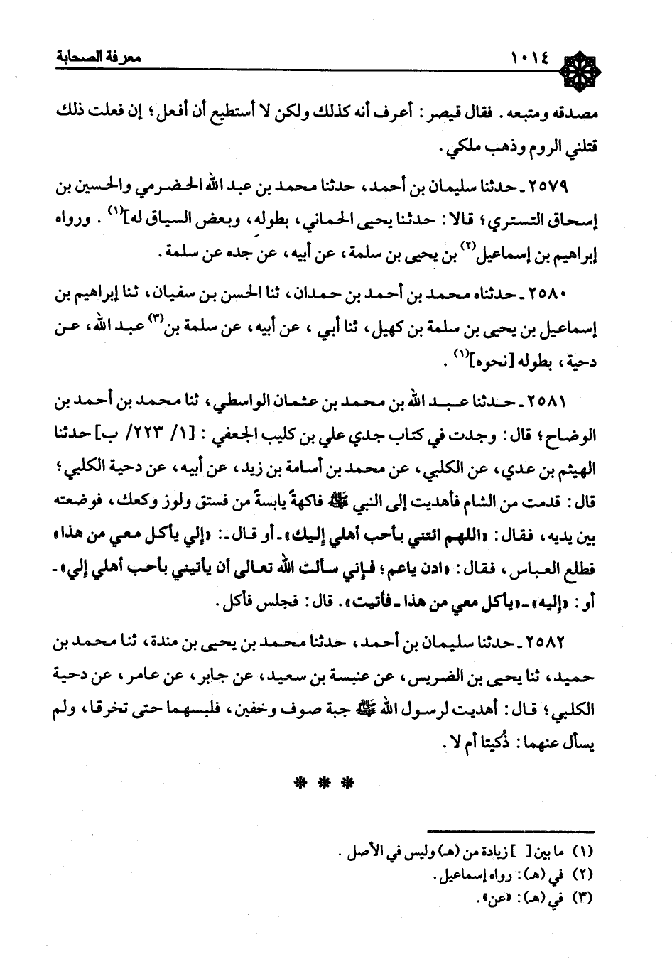 ٢٥٨١ - حَدَّثَنَا عَبْدُ اللهِ بْنُ مُحَمَّدِ بْنِ عُثْمَانَ الْوَاسِطِيُّ، ثنا مُحَمَّدُ بْنُ أَحْمَدَ الْوَضَّاحُ، قَالَ: وَجَدْتُ فِي كِتَابِ جَدِّي عَلِيِّ بْنِ كُلَيْبٍ الْجُعْفِيِّ: حَدَّثَنَا الْهَيْثَمُ بْنُ عَدِيٍّ، عَنِ الْكَلْبِيِّ، عَنْ مُحَمَّدِ بْنِ أُسَامَةَ بْنِ زَيْدٍ، عَنْ أَبِيهِ، عَنْ دِحْيَةَ الْكَلْبِيِّ، قَالَ: قَدِمْتُ مِنَ الشَّامِ فَأَهْدَيْتُ إِلَى النَّبِيِّ صَلَّى اللَّهُ عَلَيْهِ وَسَلَّمَ فَاكِهَةً يَابِسَةً مِنْ فُسْتُقٍ وَلَوْزٍ وَكَعْكٍ، فَوَضَعْتُهُ بَيْنَ يَدَيْهِ، فَقَالَ: «اللهُمَّ ائْتِنِي بِأَحَبِّ أَهْلِي إِلَيْكَ» : أَوْ قَالَ: «إِلَيَّ يَأْكُلُ مَعِي مِنْ هَذَا» فَطَلَعَ الْعَبَّاسُ، فَقَالَ: «ادْنُ يَا عَمِّ فَإِنِّي سَأَلْتُ اللهَ تَعَالَى أَنْ يَأْتِيَنِي بِأَحَبِّ أَهْلِي إِلَيَّ» أَوْ: «إِلَيْهِ» ، «يَأْكُلُ مَعِي مِنْ هَذَا فَأَتَيْتَ» ، قَالَ: فَجَلَسَ فَأَكَلَ "
