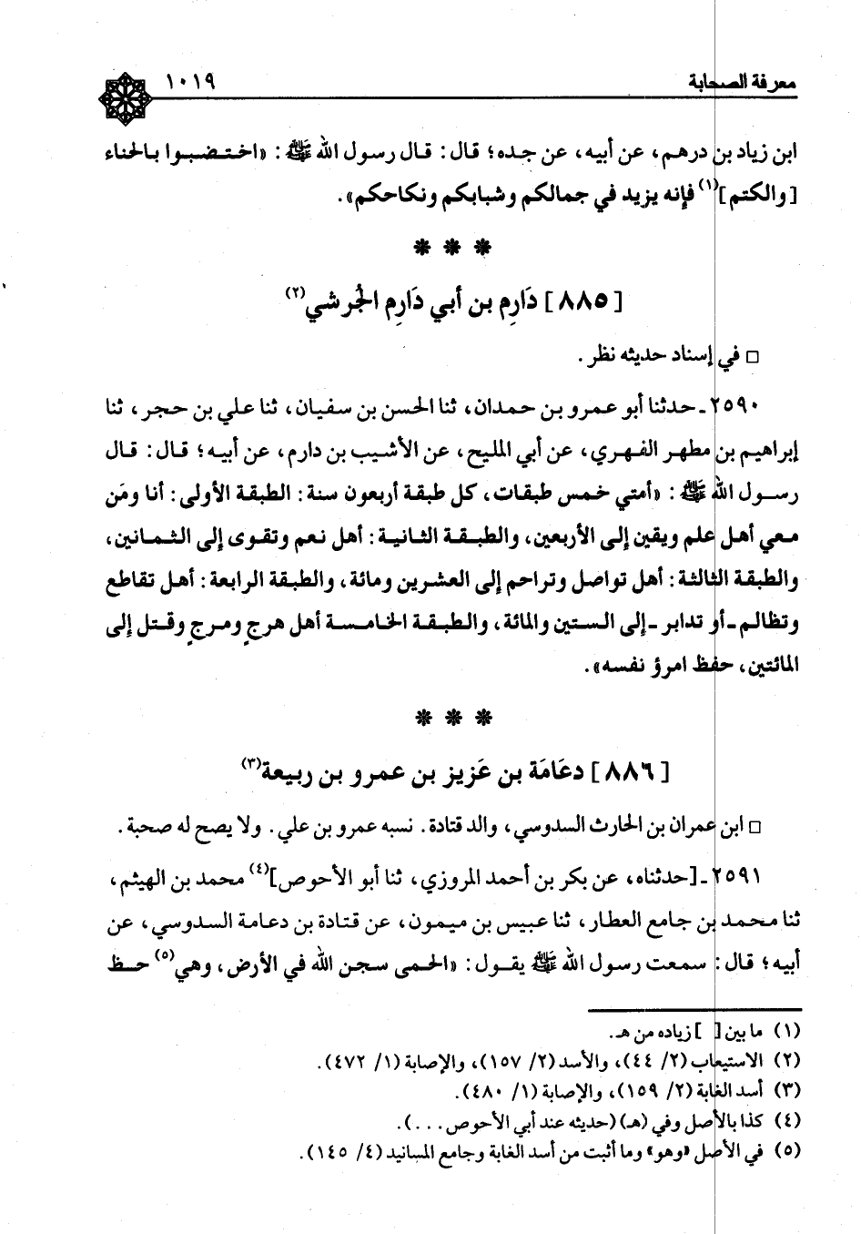 ٢٥٩٠ - حَدَّثَنَا أَبُو عَمْرِو بْنُ حَمْدَانَ، ثنا الْحَسَنُ بْنُ سُفْيَانَ، ثنا عَلِيُّ بْنُ حُجْرٍ، ثنا إِبْرَاهِيمُ بْنُ مُطَهَّرٍ الْفِهْرِيُّ، عَنْ أَبِي الْمَلِيحِ، عَنِ الْأَشْيَبِ بْنِ دَارِمٍ، عَنْ أَبِيهِ، قَالَ: قَالَ رَسُولُ اللهِ صَلَّى اللَّهُ عَلَيْهِ وَسَلَّمَ: " أُمَّتِي خَمْسُ طَبَقَاتٍ، كُلُّ طَبَقَةٍ أَرْبَعُونَ سَنَةً: الطَّبَقَةُ الْأُولَى: أَنَا وَمَنْ مَعِي أَهْلُ عِلْمٍ وَيَقِينٍ إِلَى الْأَرْبَعِينَ، وَالطَّبَقَةُ الثَّانِيَةُ: أَهْلُ نِعَمٍ وَتَقْوَى إِلَى الثَّمَانِينَ، وَالطَّبَقَةُ الثَّالِثَةُ: أَهْلُ تُوَاصُلٍ وَتَرَاحُمٍ إِلَى الْعِشْرِينَ وَمِائَةٍ، وَالطَّبَقَةُ الرَّابِعَةُ: أَهْلُ تُقَاطُعٍ وَتَظَالُمٍ أَوْ تَدَابُرٍ إِلَى السِّتِّينَ وَالْمِائَةِ، وَالطَّبَقَةُ الْخَامِسَةُ أَهْلُ هَرْجٍ وَمَرْجٍ وَقَتْلٍ إِلَى الْمِائَتَيْنِ , حَفِظَ امْرُؤٌ نَفْسَهُ "