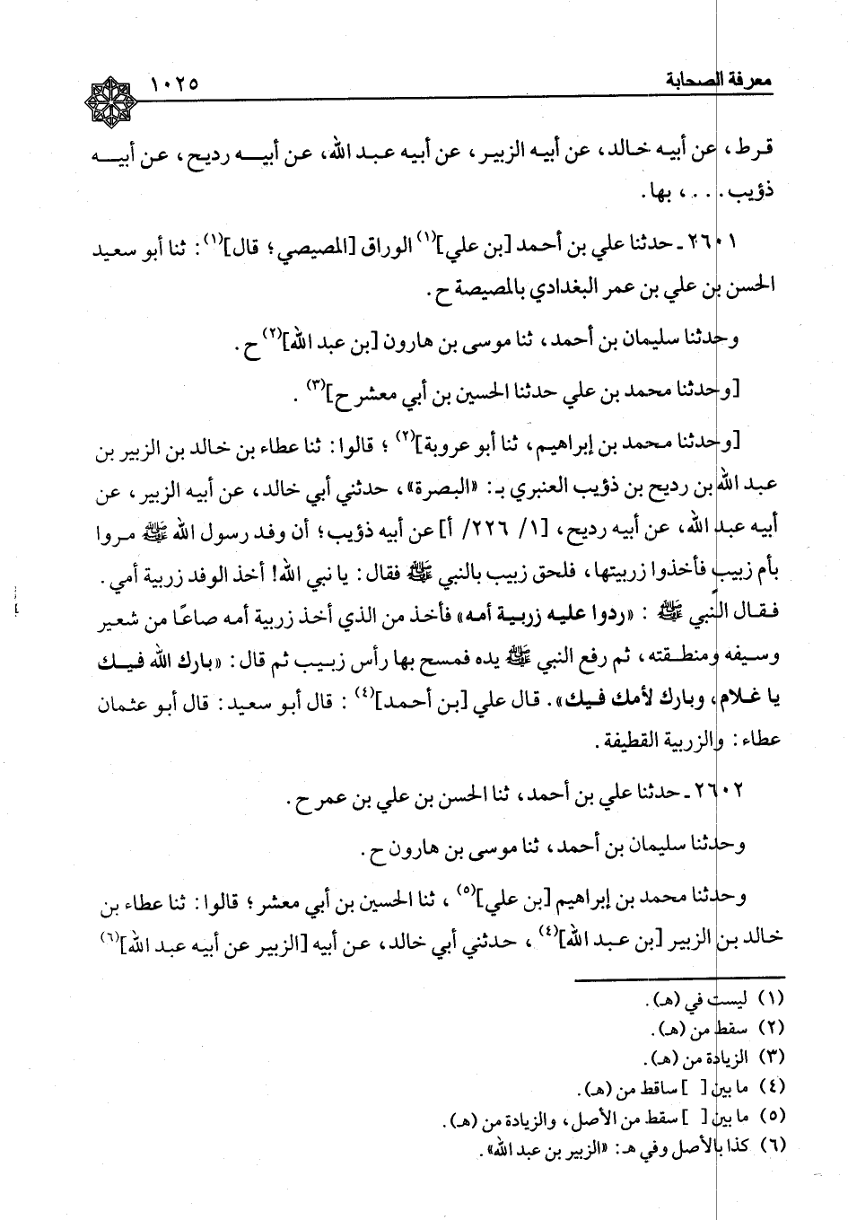 ٢٦٠٠ - حَدَّثَنَا عَلِيُّ بْنُ أَحْمَدَ بْنِ عَلِيٍّ الْوَرَّاقُ الْمِصِّيصِيُّ، قَالَ: ثنا أَبُو سَعِيدٍ الْحَسَنُ بْنُ عَلِيِّ بْنِ عُمَرَ الْبَغْدَادِيُّ، بِالْمَصِّيصَةِ ح وَحَدَّثَنَا سُلَيْمَانُ بْنُ أَحْمَدَ، ثنا مُوسَى بْنُ هَارُونَ بْنِ عَبْدِ اللهِ، ح وَحَدَّثَنَا مُحَمَّدُ بْنُ عَلِيٍّ، حَدَّثَنَا الْحُسَيْنُ بْنُ أَبِي مَعْشَرٍ، ح وَحَدَّثَنَا مُحَمَّدُ بْنُ إِبْرَاهِيمَ، ثنا أَبُو عَرُوبَةَ، قَالُوا: ثنا عَطَاءُ بْنُ خَالِدِ بْنِ الزُّبَيْرِ بْنِ عَبْدِ اللهِ بْنِ رُدَيْحِ بْنِ ذُؤَيْبٍ الْعَنْبَرِيُّ بِالْبَصْرَةِ، حَدَّثَنِي أَبِي خَالِدٌ، عَنْ أَبِيهِ الزُّبَيْرِ، عَنْ أَبِيهِ عَبْدِ اللهِ، عَنْ أَبِيهِ رُدَيْحٍ، عَنْ أَبِيهِ ذُؤَيْبٍ أَنَّ وَفْدَ رَسُولِ اللهِ صَلَّى اللَّهُ عَلَيْهِ وَسَلَّمَ مَرُّوا بِأُمِّ زَبِيبٍ فَأَخَذُوا زِرْبِيَّتَهَا، فَلَحِقَ زَبِيبٌ بِالنَّبِيِّ صَلَّى اللَّهُ عَلَيْهِ وَسَلَّمَ فَقَالَ: يَا نَبِيَّ اللهِ، أَخَذَ الْوَفْدَ زِرْبِيَّةَ أُمِّي فَقَالَ النَّبِيُّ صَلَّى اللَّهُ عَلَيْهِ وَسَلَّمَ: «رُدُّوا عَلَيْهِ زِرْبِيَّةَ أُمِّهِ» فَأَخَذَ مِنَ الَّذِي أَخَذَ زِرْبِيَّةَ أُمِّهِ صَاعًا مِنْ شَعِيرٍ وَسَيْفَهُ وَمِنْطَقَتَهُ، ثُمَّ رَفَعَ النَّبِيُّ صَلَّى اللَّهُ عَلَيْهِ وَسَلَّمَ يَدَهُ فَمَسَحَ بِهَا رَأْسَ زَبِيبٍ ثُمَّ قَالَ: «بَارَكَ اللهُ فِيكَ يَا غُلَامُ، وَبَارَكَ لِأُمِّكَ فِيكَ» قَالَ عَلِيُّ بْنُ أَحْمَدَ: قَالَ أَبُو سَعِيدٍ: قَالَ أَبُو عُثْمَانَ عَطَاءٌ: وَالزِّرْبِيَّةُ الْقَطِيفَةُ
