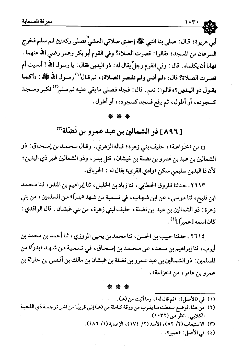 ذُو الشِّمَالَيْنِ ابْنُ عَبْدِ عَمْرِو بْنِ نَضْلَةَ مِنْ «خُزَاعَةَ» ، حَلِيفُ بَنِي زُهْرَةَ، قَالَهُ الزُّهْرِيُّ وَقَالَ مُحَمَّدُ بْنُ إِسْحَاقَ: ذُو الشِّمَالَيْنِ ابْنُ عَبْدِ بْنِ عَمْرِو بْنِ نَضْلَةَ بْنِ غَيْشَانَ، قُتِلَ بِبَدْرٍ، وَذُو الشِّمَالَيْنِ غَيْرُ ذِي الْيَدَيْنِ؛ لِأَنَّ ذَا الْيَدَيْنِ سُلَيْمِيٌّ سَكَنَ «وَادِي الْقُرَى» يُقَالُ لَهُ: الْخِرْبَاقُ