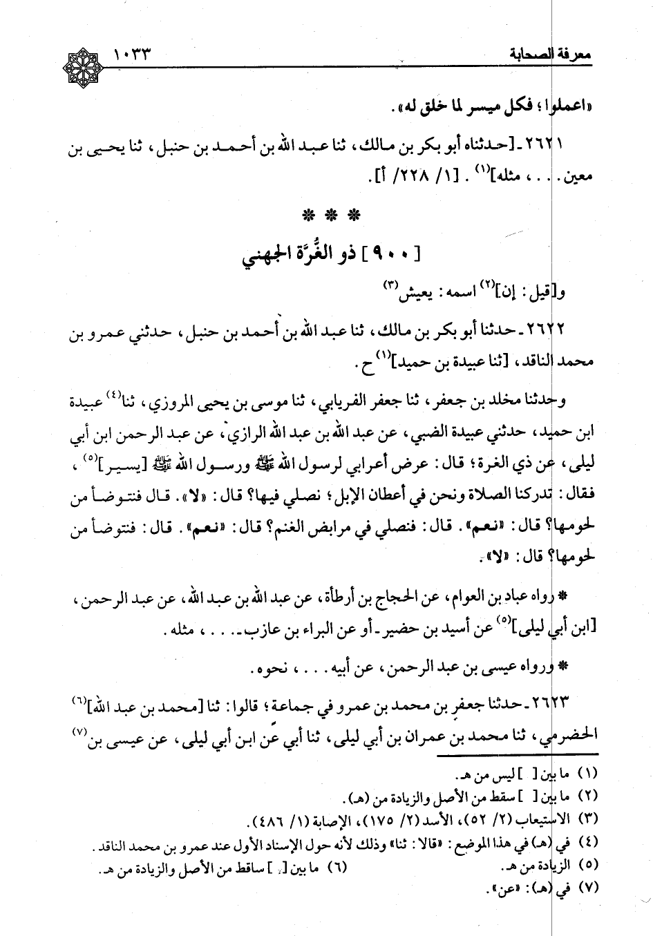 ٢٦٢٣ - حَدَّثَنَا جَعْفَرُ بْنُ مُحَمَّدِ بْنِ عَمْرٍو، فِي جَمَاعَةٍ، قَالُوا: ثنا مُحَمَّدُ بْنُ عَبْدِ اللهِ الْحَضْرَمِيُّ، ثنا مُحَمَّدُ بْنُ عِمْرَانَ بْنِ أَبِي لَيْلَى، ثنا أَبِي، عَنِ ابْنِ أَبِي لَيْلَى، عَنْ عِيسَى بْنِ ⦗١٠٣٤⦘ عَبْدِ الرَّحْمَنِ بْنِ أَبِي لَيْلَى، عَنْ يَعِيشَ الْجُهَنِيِّ يُعْرَفُ بِذِي الْغُرَّةِ: أَنَّ أَعْرَابِيًّا أَتَى النَّبِيَّ صَلَّى اللَّهُ عَلَيْهِ وَسَلَّمَ فَقَالَ: أَتَوَضَّأُ مِنْ لُحُومِ الْغَنَمِ؟ فَذَكَرَ نَحْوَهُ، وَقِيلَ: إِنَّ الْبَرَاءَ بْنَ عَازِبٍ كَانَ فِي وَجْهِهِ بَيَاضٌ أَوْ نَحْوُهُ فَسُمِّيَ: ذَا الْغُرَّةِ