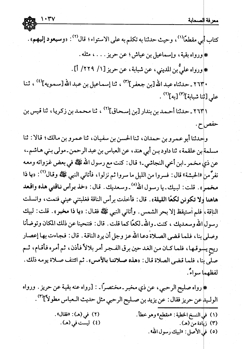 ٢٦٣١ - حَدَّثَنَا أَحْمَدُ بْنُ بُنْدَارِ بْنِ إِسْحَاقَ، ثنا مُحَمَّدُ بْنُ زَكَرِيَّا، ثنا قَيْسُ بْنُ حَفْصٍ، ح وَحَدَّثَنَا أَبُو عَمْرِو بْنُ حَمْدَانَ، ثنا الْحَسَنُ بْنُ سُفْيَانَ، ثنا عَمْرُو بْنُ مَالِكٍ، قَالَا: ثنا مَسْلَمَةُ بْنُ عَلْقَمَةَ، ثنا دَاوُدُ بْنُ أَبِي هِنْدَ، عَنِ الْعَبَّاسِ بْنِ عَبْدِ الرَّحْمَنِ، مَوْلَى بَنِي هَاشِمٍ، عَنْ ذِي مِخْمَرٍ ابْنِ أَخِي النَّجَاشِيِّ، قَالَ: كُنْتُ مَعَ رَسُولِ اللهِ صَلَّى اللَّهُ عَلَيْهِ وَسَلَّمَ فِي بَعْضِ غَزَوَاتِهِ وَمَعَهُ نَفَرٌ مِنَ «الْحَبَشَةِ» قَالَ: فَسَرَوْا مِنَ اللَّيْلِ مَا سَرَوْا ثُمَّ نَزَلُوا، فَأَتَانِيَ النَّبِيُّ صَلَّى اللَّهُ عَلَيْهِ وَسَلَّمَ وَقَالَ: «يَا ذَا مِخْمَرٍ» ، قُلْتُ: لَبَّيْكَ يَا رَسُولَ اللهِ وَسَعْدَيْكَ، قَالَ: «خُذْ بِرَأْسِ نَاقَتِي هَذِهِ وَاقْعُدْ هَا هُنَا وَلَا تَكُونَنَّ لُكُعًا اللَّيْلَةَ» ، قَالَ: فَأَخَذْتُ بِرَأْسِ النَّاقَةِ فَغَلَبَتْنِي عَيْنِي فَنِمْتُ، وَانْسَلَّتِ النَّاقَةُ، فَلَمِ اسْتَيْقَظَ إِلَّا بَحرِّ الشَّمْسِ، وَأَتَانِي النَّبِيُّ صَلَّى اللَّهُ عَلَيْهِ وَسَلَّمَ، فَقَالَ: «يَا ذَا مِخْمَرٍ» قُلْتُ: لَبَّيْكَ رَسُولَ اللهِ وَسَعْدَيْكَ كُنْتُ وَاللِّهِ لُكَعًا كَمَا قُلْتَ، قَالَ: فَتَنَحَّيْنَا عَنْ ذَلِكَ الْمَكَانِ وَتَوَضَّأْنَا وَصَلَّى بِنَا، فَلَمَّا قَضَى الصَّلَاةَ دَعَا اللهَ عَزَّ وَجَلَّ أَنْ يَرُدَّ النَّاقَةَ، قَالَ: فَجَاءَتْ بِهَا إِعْصَارُ رِيحٍ يَسُوقُهَا، فَلَمَّا كَانَ مِنَ الْغَدِ حِينَ بَرَقَ الْفَجْرُ أَمَرَ بِلَالًا فَأَذَّنَ، ثُمَّ أَمَرَهُ فَأَقَامَ، ثُمَّ صَلَّى بِنَا، فَلَمَّا قَضَى الصَّلَاةَ قَالَ: «هَذِهِ صَلَاتُنَا بِالْأَمْسِ» ، ثُمَّ ائْتَنَفَ صَلَاةَ يَوْمِهِ. ذَلِكَ لَفْظُهُمَا سَوَاءً. رَوَاهُ صُلَيْحٌ الرَّحَبِيُّ، عَنْ ذِي مِخْبَرٍ مُخْتَصَرًا، رَوَاهُ عَنْهُ بَقِيَّةُ، عَنْ حَرِيزٍ وَرَوَاهُ الْوَلِيدُ، عَنْ حَرِيزٍ فَقَالَ: عَنْ يَزِيدَ بْنِ صُلَيْحٍ الرَّحَبِيِّ مِثْلَ حَدِيثِ الْعَبَّاسِ مُطَوَّلًا