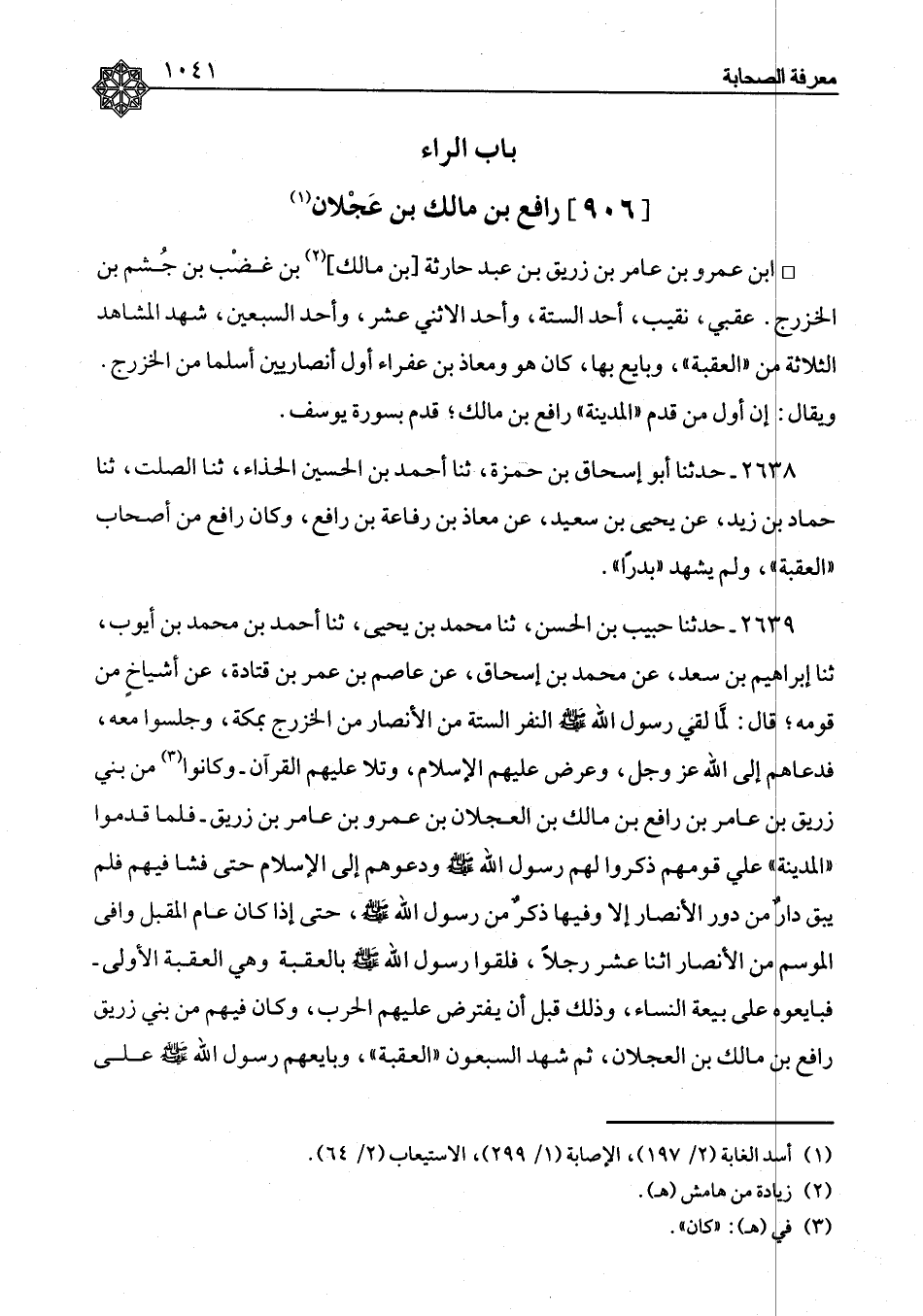 ٢٦٣٩ - حَدَّثَنَا حَبِيبُ بْنُ الْحَسَنِ، ثنا مُحَمَّدُ بْنُ يَحْيَى، ثنا أَحْمَدُ بْنُ مُحَمَّدِ بْنِ أَيُّوبَ، ثنا إِبْرَاهِيمُ بْنُ سَعْدٍ، عَنْ مُحَمَّدِ بْنِ إِسْحَاقَ، عَنْ عَاصِمِ بْنِ عُمَرَ بْنِ قَتَادَةَ، عَنْ أَشْيَاخٍ، مِنْ قَوْمِهِ، قَالَ: «لَمَّا لَقِيَ رَسُولُ اللهِ صَلَّى اللَّهُ عَلَيْهِ وَسَلَّمَ النَّفَرَ السِّتَّةَ مِنَ الْأَنْصَارِ مِنَ الْخَزْرَجِ بِمَكَّةَ، وَجَلَسُوا مَعَهُ، فَدَعَاهُمْ إِلَى اللهِ عَزَّ وَجَلَّ، وَعَرَضَ عَلَيْهِمُ الْإِسْلَامَ، وَتَلَا عَلَيْهِمُ الْقُرْآنَ وَكَانُوا مِنْ بَنِي زُرَيْقِ بْنِ عَامِرِ بْنِ رَافِعِ بْنِ مَالِكِ بْنِ الْعَجْلَانِ بْنِ عَمْرِو بْنِ عَامِرِ بْنِ زُرَيْقٍ فَلَمَّا قَدِمُوا» الْمَدِينَةَ «عَلَى قَوْمِهِمْ ذَكَرُوا لَهُمْ رَسُولَ اللهِ صَلَّى اللَّهُ عَلَيْهِ وَسَلَّمَ، وَدَعَوْهُمْ إِلَى الْإِسْلَامِ حَتَّى فَشَا فِيهِمْ فَلَمْ يَبْقَ دَارٌ مِنْ دُورِ الْأَنْصَارِ إِلَّا وَفِيهَا ذِكْرٌ مِنْ رَسُولِ اللهِ صَلَّى اللَّهُ عَلَيْهِ وَسَلَّمَ، حَتَّى إِذَا كَانَ عَامُ الْمُقْبِلِ وَافَى الْمَوْسِمَ مِنَ الْأَنْصَارِ اثْنَا عَشَرَ رَجُلًا، فَلَقَوْا رَسُولَ اللهِ صَلَّى اللَّهُ عَلَيْهِ وَسَلَّمَ بِالْعَقَبَةِ وَهِيَ الْعَقَبَةُ الْأُولَى فَبَايَعُوهُ عَلَى بَيْعَةِ النِّسَاءِ، وَذَلِكَ قَبْلَ أَنْ يُفْتَرَضَ عَلَيْهِمُ الْحَرْبُ، وَكَانَ فِيهِمْ مِنْ بَنِي زُرَيْقٍ رَافِعُ بْنُ مَالِكِ بْنِ الْعَجْلَانِ، ثُمَّ شَهِدَ السَّبْعُونَ» الْعَقَبَةَ «، وَبَايَعَهُمْ رَسُولُ اللهِ صَلَّى اللَّهُ عَلَيْهِ وَسَلَّمَ عَلَى ⦗١٠٤٢⦘ حَرْبِ الْأَحْمَرِ وَالْأَسْوَدِ، وَاشْتَرَطَ عَلَى الْقَوْمِ لِرَبِّهِ عَزَّ وَجَلَّ، وَجَعَلَ لَهُمْ عَلَى الْوَفَاءِ بِذَلِكَ الْجَنَّةَ، فَكَانَ فِيهِمْ رَافِعُ بْنُ مَالِكِ بْنِ الْعَجْلَانِ نَقِيبًا»