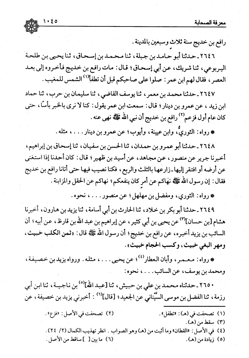 ٢٦٤٦ - حَدَّثَنَا أَبُو حَامِدِ بْنُ جَبَلَةَ، ثنا مُحَمَّدُ بْنُ إِسْحَاقَ، ثنا يَحْيَى بْنُ طَلْحَةَ الْيَرْبُوعِيُّ، ثنا شَرِيكٌ، عَنْ أَبِي إِسْحَاقَ، قَالَ: " مَاتَ رَافِعُ بْنُ خَدِيجٍ فَأَخَّرُوهُ إِلَى بَعْدِ الْعَصْرِ، فَقَالَ لَهُمُ ابْنُ عُمَرَ: صَلُّوا عَلَى صَاحِبِكُمْ قَبْلَ أَنْ تُطْفَأَ الشَّمْسُ لِلْمَغِيبِ "