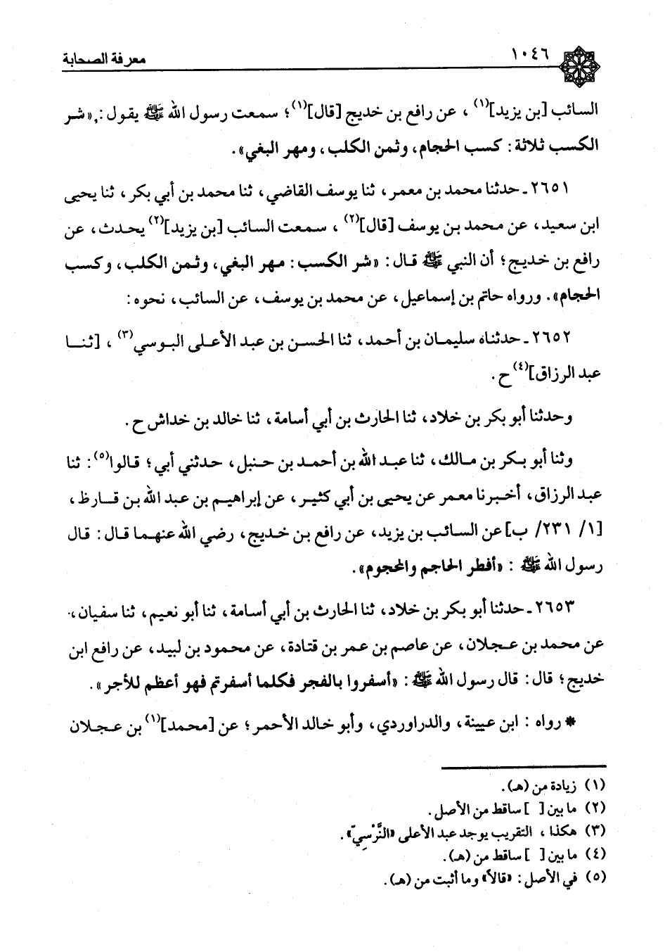 ٢٦٥٢ - حَدَّثَنَاهُ سُلَيْمَانُ بْنُ أَحْمَدَ، ثنا الْحَسَنُ بْنُ عَبْدِ الْأَعْلَى الْبُوسِيُّ، ثنا عَبْدُ الرَّزَّاقِ، ح وَحَدَّثَنَا أَبُو بَكْرِ بْنُ خَلَّادٍ، ثنا الْحَارِثُ بْنُ أَبِي أُسَامَةَ، ثنا خَالِدُ بْنُ خِدَاشٍ ح , وَثَنَا أَبُو بَكْرِ بْنُ مَالِكٍ , ثنا عَبْدُ اللهِ بْنُ أَحْمَدَ بْنِ حَنْبَلٍ , حَدَّثَنِي أَبِي قَالُوا: ثنا عَبْدُ الرَّزَّاقِ، أَخْبَرَنَا مَعْمَرٌ، عَنْ يَحْيَى بْنِ أَبِي كَثِيرٍ، عَنْ إِبْرَاهِيمَ بْنِ عَبْدِ اللهِ بْنِ قَارِظٍ، عَنِ السَّائِبِ بْنِ يَزِيدَ، عَنْ رَافِعِ بْنِ خَدِيجٍ، رَضِيَ اللهُ عَنْهُمَا قَالَ: قَالَ رَسُولُ اللهِ صَلَّى اللَّهُ عَلَيْهِ وَسَلَّمَ: «أَفْطَرَ الْحَاجِمُ وَالْمَحْجُومُ»