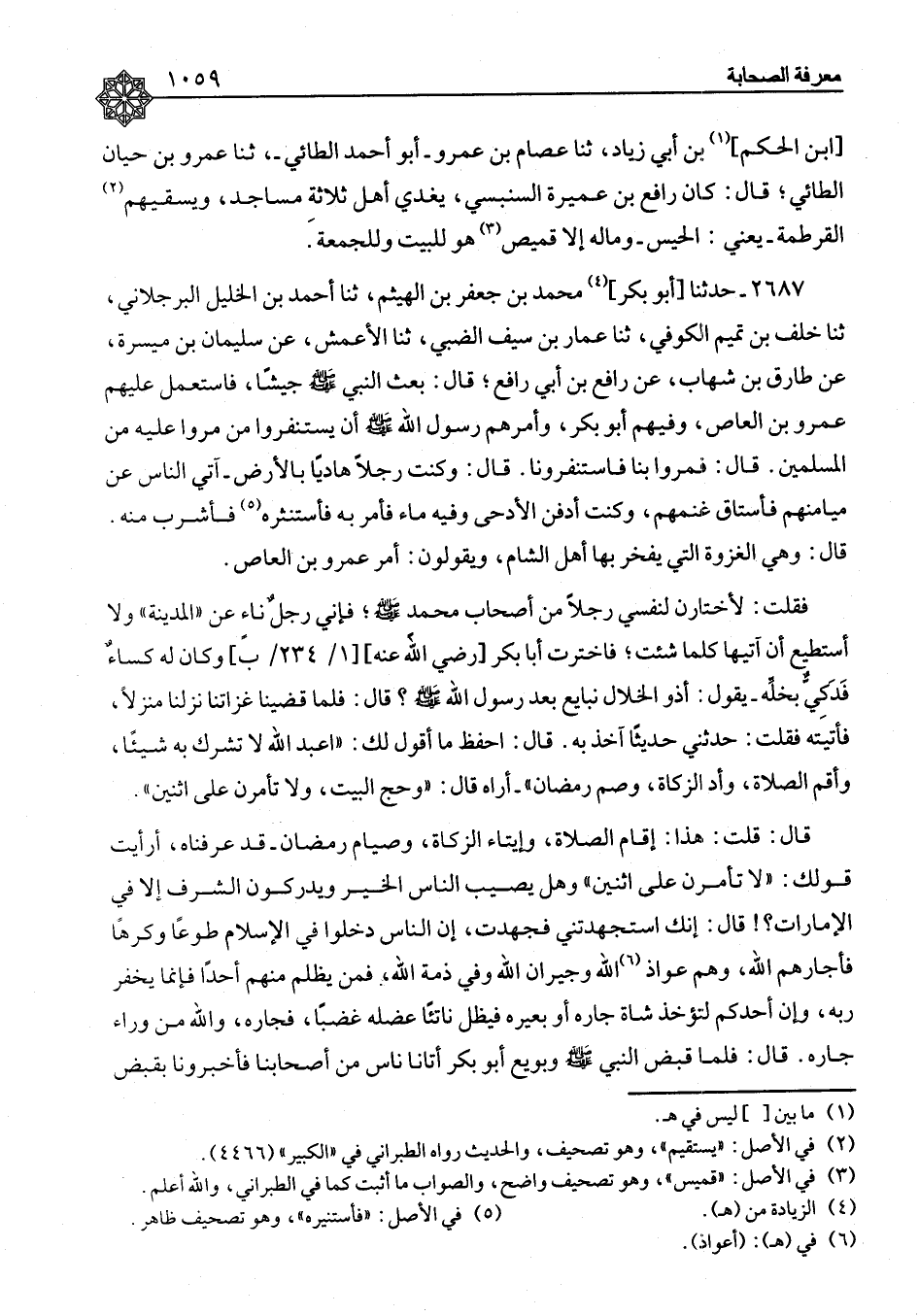 ٢٦٨٧ - حَدَّثَنَا أَبُو بَكْرٍ مُحَمَّدُ بْنُ جَعْفَرِ بْنِ الْهَيْثَمِ، ثنا أَحْمَدُ بْنُ الْخَلِيلِ الْبُرْجُلَانِيُّ، ثنا خَلَفُ بْنُ تَمِيمٍ الْكُوفِيُّ، ثنا عَمَّارُ بْنُ سَيْفٍ الضَّبِّيُّ، ثنا الْأَعْمَشُ، عَنْ سُلَيْمَانَ بْنِ مَيْسَرَةَ، عَنْ طَارِقِ بْنِ شِهَابٍ، عَنْ رَافِعِ بْنِ أَبِي رَافِعٍ، قَالَ: " بَعَثَ النَّبِيُّ صَلَّى اللَّهُ عَلَيْهِ وَسَلَّمَ جَيْشًا، فَاسْتَعْمَلَ عَلَيْهِمْ عَمْرَو بْنَ الْعَاصِ، وَفِيهِمْ أَبُو بَكْرٍ، وَأَمَرَهُمْ رَسُولُ اللهِ صَلَّى اللَّهُ عَلَيْهِ وَسَلَّمَ أَنْ يَسْتَنْفِرُوا مَنْ مَرُّوا عَلَيْهِ مِنَ الْمُسْلِمِينَ، قَالَ: فَمَرُّوا بِنَا فَاسْتَنْفَرُونَا، قَالَ: وَكُنْتُ رَجُلًا هَادِيًا بِالْأَرْضِ آتِي النَّاسَ عَنْ مَيَامِنِهِمْ فَأَسْتَاقُ غَنَمَهُمْ، وَكُنْتُ أَدْفِنُ الْأَدْحَى وَفِيهِ مَاءٌ فَأَمُرُّ بِهِ فَأَسْتَنْثِرُهُ فَأَشْرَبُ مِنْهُ، قَالَ: وَهِيَ الْغَزْوَةُ الَّتِي يَفْخَرُ بِهَا أَهْلُ الشَّامِ، وَيَقُولُونَ: أَمَّرَ عَمْرَو بْنَ الْعَاصِ، فَقُلْتَ: لَأَخْتَارَنَّ لِنَفْسِي رَجُلًا مِنْ أَصْحَابِ مُحَمَّدٍ صَلَّى اللَّهُ عَلَيْهِ وَسَلَّمَ، فَإِنِّي رَجُلٌ نَاءٍ عَنِ الْمَدِينَةِ وَلَا أَسْتَطِيعُ أَنْ آتِيَهَا كُلَّمَا شِئْتُ، فَاخْتَرْتُ أَبَا بَكْرٍ رَضِيَ اللهُ عَنْهُ وَكَانَ لَهُ كِسَاءٌ فَدَكِيٌّ بِخَلِّهِ، يَقُولُ: أَذُو الْخِلَالِ نُبَايِعُ بَعْدَ رَسُولِ اللهِ صَلَّى اللَّهُ عَلَيْهِ وَسَلَّمَ؟ قَالَ: فَلَمَّا قَضَيْنَا غَزَاتَنَا نَزَلْنَا مَنْزِلًا، فَأَتَيْتُهُ فَقُلْتُ: حَدِّثْنِي حَدِيثًا آخُذُ بِهِ، قَالَ: احْفَظْ مَا أَقُولُ لَكَ: أُعْبِدِ اللهَ لَا تُشْرِكْ بِهِ شَيْئًا، وَأَقِمِ الصَّلَاةَ، وَأَدِّ الزَّكَاةَ، وَصُمْ رَمَضَانَ " أُرَاهُ قَالَ: «وَحُجَّ الْبَيْتَ، وَلَا تَأَمَّرَنَّ عَلَى اثْنَيْنِ» قَالَ: قُلْتُ: هَذَا إِقَامُ الصَّلَاةِ، وَإِيتَاءُ الزَّكَاةِ، وَصِيَامُ رَمَضَانَ، قَدْ عَرَفْنَاهُ، أَرَأَيْتَ قَوْلَكَ: لَا تَأَمَّرَنَّ عَلَى اثْنَيْنِ؟ وَهَلْ يُصِيبُ النَّاسُ الْخَيْرَ وَيُدْرِكُونَ الشَّرَفَ إِلَّا فِي الْإِمَارَاتِ؟ قَالَ: إِنَّكُ اسْتَجْهَدْتَنِي فَجَهَدْتُ، إِنَّ النَّاسَ دَخَلُوا فِي الْإِسْلَامِ طَوْعًا وَكَرْهًا فَأَجَارَهُمُ اللهُ وَهُمْ عُوَّاذُ اللهِ وَجِيرَانُ اللهِ وَفِي ذِمَّةِ اللهِ، فَمَنْ يَظْلِمْ مِنْهُمْ أَحَدًا فَإِنَّمَا يَخْفِرُ رَبَّهُ، وَإِنَّ أَحَدَكُمْ لَتُؤْخَذُ شَاةُ جَارِهِ أَوْ بَعِيرُهُ فَيَظَلُّ نَاتِئًا عَضَلُهُ غَضَبًا، فَجَارُهُ، وَاللهُ مِنْ وَرَاءِ جَارِهِ، قَالَ: فَلَمَّا قُبِضَ النَّبِيُّ صَلَّى اللَّهُ عَلَيْهِ وَسَلَّمَ وَبُويِعَ أَبُو بَكْرٍ أَتَانَا نَاسٌ مِنْ أَصْحَابِنَا فَأَخْبَرُونَا بِقَبْضِ ⦗١٠٦٠⦘ النَّبِيِّ صَلَّى اللَّهُ عَلَيْهِ وَسَلَّمَ وَخِلَافَةِ أَبِي بَكْرٍ رَضِيَ اللهُ عَنْهُ، قَالَ: قُلْتُ لِصَاحِبِي الَّذِي قَالَ لِي فَتَحَمَّلْتُ إِلَيْهِ، قَالَ: فَتَعَرَّضْتُ لَهُ حَتَّى وَجَدْتُ خَلْوَةً، قَالَ: قُلْتُ: أَتَعْرِفُنِي؟ قَالَ: نَعَمْ، أَلَسْتَ صَاحِبِي؟ قَالَ: قُلْتُ: أَتَذْكُرُ مَا قُلْتَ لِي: لَا تَأَمَّرَنَّ عَلَى اثْنَيْنِ، وَقَدْ تَأَمَّرْتَ عَلَى النَّاسِ؟ قَالَ: فَقَالَ: إِنَّ رَسُولَ اللهِ صَلَّى اللَّهُ عَلَيْهِ وَسَلَّمَ قُبِضَ وَالنَّاسُ حَدِيثُ عَهْدٍ بِجَاهِلِيَّةٍ، فَخَشِيتُ أَنْ يَرْتَدُّوا وَيَخْتَلِفُوا، وَخَشِيتُ كَذَا وَكَذَا فَدَخَلْتُ فِيهِ وَأَنَا كَارِهُهُ، قَالَ: فَمَا زَالَ يَعْتَذِرُ إِلَيَّ حَتَّى عَذَرْتُهُ " رَوَاهُ وَكِيعٌ، وَأَبُو أُسَامَةَ، وَأَبُو مُعَاوِيَةَ، فِي آخَرِينَ، عَنِ الْأَعْمَشِ وَرَوَاهُ طَلْحَةُ بْنُ مُصَرِّفٍ، عَنْ سُلَيْمَانَ، عَنْ 