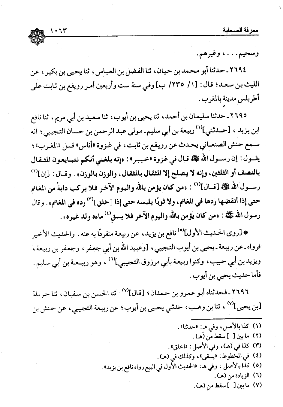 ٢٦٩٥ - حَدَّثَنَا سُلَيْمَانُ بْنُ أَحْمَدَ، ثنا يَحْيَى بْنُ أَيُّوبَ، ثنا سَعِيدُ بْنُ أَبِي مَرْيَمَ، ثنا نَافِعُ بْنُ يَزِيدَ، حَدَّثَنِي رَبِيعَةُ بْنُ أَبِي سُلَيْمٍ، مَوْلَى عَبْدِ الرَّحْمَنِ بْنِ حَسَّانَ التُّجِيبِيِّ أَنَّهُ سَمِعَ حَنَشًا الصَّنْعَانِيَّ، يُحَدِّثُ عَنْ رُوَيْفِعِ بْنِ ثَابِتٍ، فِي غَزْوَةِ أُنَاسٍ، قِبَلَ الْمَغْرِبِ، يَقُولُ: إِنَّ رَسُولَ اللهِ صَلَّى اللَّهُ عَلَيْهِ وَسَلَّمَ قَالَ فِي غَزْوَةِ خَيْبَرَ: «إِنَّهُ بَلَغَنِي أَنَّكُمْ تَتَبَايَعُونَ الْمِثْقَالَ بِالنِّصْفِ أَوِ الثُّلُثَيْنِ، وَإِنَّهُ لَا يَصْلُحُ إِلَّا الْمِثْقَالُ بِالْمِثْقَالِ، وَالْوَزْنُ بِالْوَزْنِ»