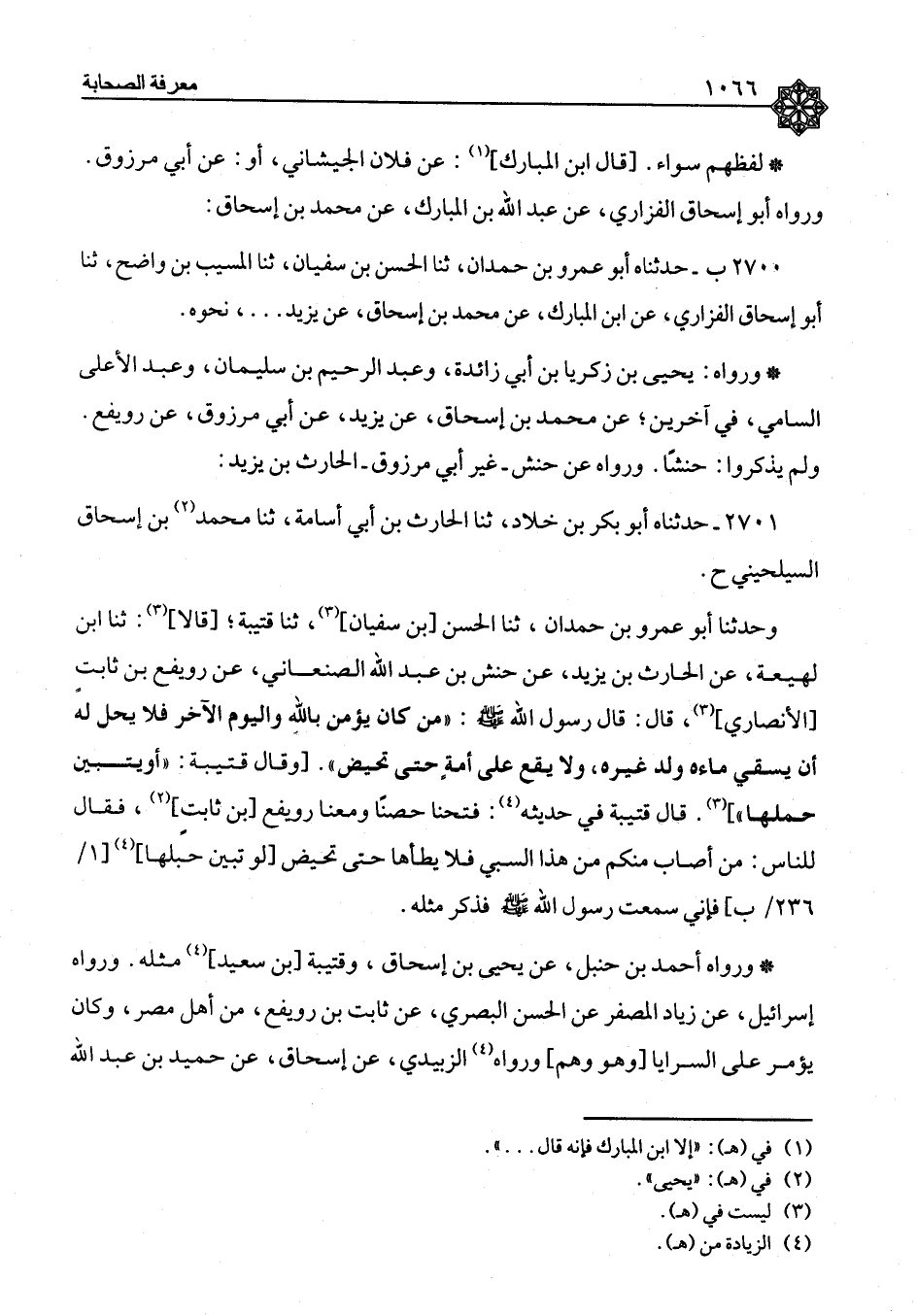 ٢٧٠١ - حَدَّثَنَاهُ أَبُو بَكْرِ بْنُ خَلَّادٍ، ثنا الْحَارِثُ بْنُ أَبِي أُسَامَةَ، ثنا مُحَمَّدُ بْنُ إِسْحَاقَ السَّيْلَحِينِيُّ، ح وَحَدَّثَنَا أَبُو عَمْرِو بْنُ حَمْدَانَ، ثنا الْحَسَنُ بْنُ سُفْيَانَ، ثنا قُتَيْبَةُ، قَالَا: ثنا ابْنُ لَهِيعَةَ، عَنِ الْحَارِثِ بْنِ يَزِيدَ، عَنْ حَنَشِ بْنِ عَبْدِ اللهِ الصَّنْعَانِيِّ، عَنْ رُوَيْفِعِ بْنِ ثَابِتٍ الْأَنْصَارِيِّ، قَالَ: قَالَ رَسُولُ اللهِ صَلَّى اللَّهُ عَلَيْهِ وَسَلَّمَ: «مَنْ كَانَ يُؤْمِنُ بِاللهِ وَالْيَوْمِ الْآخِرِ فَلَا يَحِلُّ لَهُ أَنْ يَسْقِيَ مَاءَهُ وَلَدَ غَيْرِهِ، وَلَا يَقَعَ عَلَى أَمَةٍ حَتَّى تَحِيضَ» وَقَالَ قُتَيْبَةُ: «أَوْ يَتَبَيَّنُ حَمْلُهَا» قَالَ قُتَيْبَةُ فِي حَدِيثِهِ: فَتَحْنَا حِصْنًا وَمَعَنَا رُوَيْفِعُ بْنُ ثَابِتٍ، فَقَالَ لِلنَّاسِ: مَنْ أَصَابَ مِنْكُمْ مِنْ هَذَا السَّبْيِ فَلَا يَطَأْهَا حَتَّى تَحِيضَ لَوْ تَبَيَّنَ حَبَلُهَا؛ فَإِنِّي سَمِعْتُ رَسُولَ اللهِ صَلَّى اللَّهُ عَلَيْهِ وَسَلَّمَ فَذَكَرَ مِثْلَهُ وَرَوَاهُ أَحْمَدُ بْنُ حَنْبَلٍ، عَنْ يَحْيَى بْنِ إِسْحَاقَ، وَقُتَيْبَةَ بْنِ سَعِيدٍ مِثْلَهُ , وَرَوَاهُ إِسْرَائِيلُ، عَنْ زِيَادٍ الْمُصَفِّرِ عَنِ الْحَسَنِ الْبَصْرِيِّ، عَنْ ثَابِتِ بْنِ رُوَيْفِعٍ، مِنْ أَهْلِ مِصْرَ، وَكَانَ يُؤَمَّرُ عَلَى السَّرَايَا وَهُوَ وَهْمٌ وَرَوَاهُ الزُّبَيْدِيُّ، عَنْ إِسْحَاقَ، عَنْ حُمَيْدِ بْنِ عَبْدِ اللهِ ⦗١٠٦٧⦘ الْعُذْرِيِّ، عَنْ عَبْدِ اللهِ بْنِ أَبِي حُذَيْفَةَ، عَنْ رُوَيْفِعٍ نَحْوَهُ