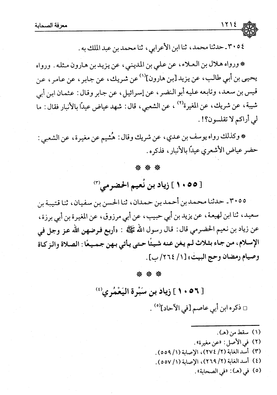 ٣٠٥٥ - حَدَّثَنَا مُحَمَّدُ بْنُ أَحْمَدَ بْنِ حَمْدَانَ، ثنا الْحَسَنُ بْنُ سُفْيَانَ، ثنا قُتَيْبَةُ بْنُ سَعِيدٍ، ثنا ابْنُ لَهِيعَةَ، عَنْ يَزِيدَ بْنِ أَبِي حَبِيبٍ، عَنْ أَبِي مَرْزُوقٍ، عَنِ الْمُغِيرَةِ بْنِ أَبِي بَرْزَةَ، عَنْ زِيَادِ بْنِ نُعَيْمٍ الْحَضْرَمِيِّ، قَالَ: قَالَ رَسُولُ اللهِ صَلَّى اللَّهُ عَلَيْهِ وَسَلَّمَ: " أَرْبَعٌ فَرَضَهُنَّ اللهُ عَزَّ وَجَلَّ فِي الْإِسْلَامِ، مَنْ جَاءَ بِثَلَاثٍ لَمْ يُغْنِ عَنْهُ شَيْئًا حَتَّى يَأْتِيَ بِهِنَّ جَمِيعًا: الصَّلَاةُ، وَالزَّكَاةُ، وَصِيَامُ رَمَضَانَ، وَحَجُّ الْبَيْتِ "