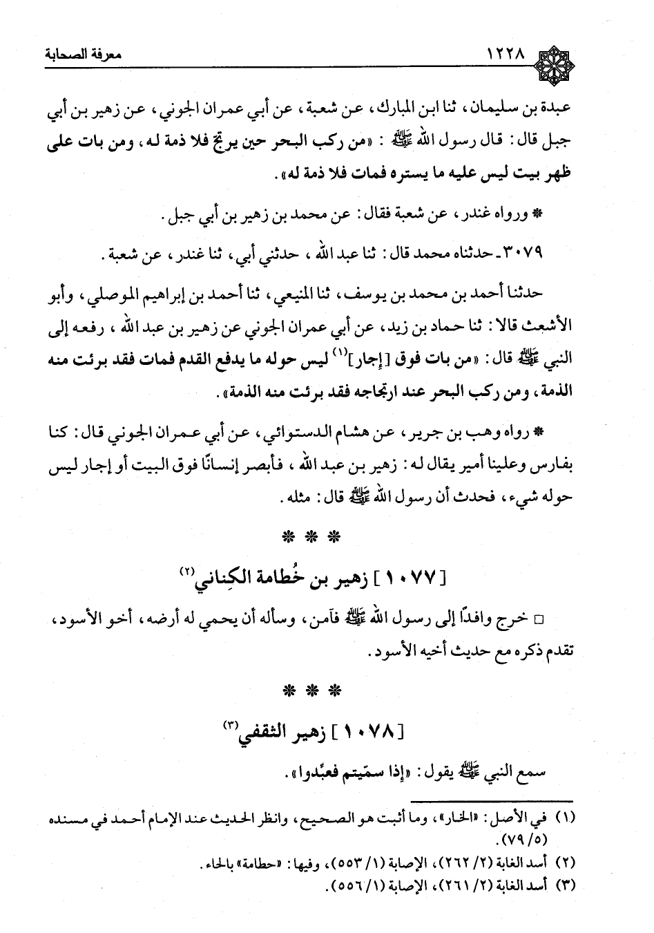 ٣٠٧٩ - حَدَّثَنَاهُ مُحَمَّدٌ، قَالَ: ثنا عَبْدُ اللهِ، حَدَّثَنِي أَبِي، ثنا غُنْدَرٌ، عَنْ شُعْبَةَ، حَدَّثَنَا أَحْمَدُ بْنُ مُحَمَّدِ بْنِ يُوسُفَ، ثنا الْمُنَيْعِيُّ، ثنا أَحْمَدُ بْنُ إِبْرَاهِيمَ الْمَوْصِلِيُّ، وَأَبُو الْأَشْعَثِ، قَالَا: ثنا حَمَّادُ بْنُ زَيْدٍ، عَنْ أَبِي عِمْرَانَ الْجَوْنِيِّ، عَنْ زُهَيْرِ بْنِ عَبْدِ اللهِ، رَفَعَهُ إِلَى النَّبِيِّ صَلَّى اللَّهُ عَلَيْهِ وَسَلَّمَ قَالَ: «مَنْ بَاتَ فَوْقَ إِجَّارٍ لَيْسَ حَوْلَهُ مَا يَدْفَعُ الْقَدَمَ فَمَاتَ فَقَدْ بَرِئَتْ مِنْهُ الذِّمَّةُ، وَمَنْ رَكِبَ الْبَحْرَ عِنْدَ ارْتِجَاجِهِ فَقَدْ بَرِئَتْ مِنْهُ الذِّمَّةُ» رَوَاهُ وَهْبُ بْنُ جَرِيرٍ، عَنْ هِشَامٍ الدَّسْتُوَائِيِّ، عَنْ أَبِي عِمْرَانَ الْجَوْنِيِّ قَالَ: كُنَّا بِفَارِسَ وَعَلَيْنَا أَمِيرٌ يُقَالُ لَهُ: زُهَيْرُ بْنُ عَبْدِ اللهِ، فَأَبْصَرَ إِنْسَانًا فَوْقَ الْبَيْتِ أَوْ إِجَّارٍ لَيْسَ حَوْلَهُ شَيْءٌ، فَحَدَّثَ أَنَّ رَسُولَ اللهِ صَلَّى اللَّهُ عَلَيْهِ وَسَلَّمَ قَالَ: مِثْلَهُ