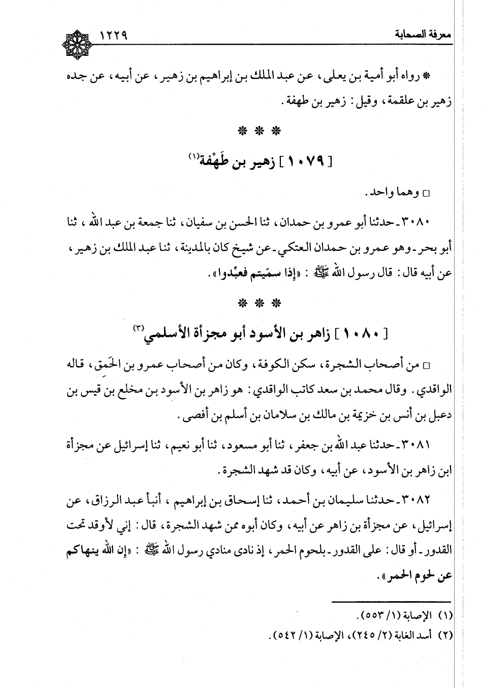 ٣٠٨٠ - حَدَّثَنَا أَبُو عَمْرِو بْنُ حَمْدَانَ، ثنا الْحَسَنُ بْنُ سُفْيَانَ، ثنا جُمُعَةُ بْنُ عَبْدِ اللهِ، ثنا أَبُو بَحْرٍ وَهُوَ عَمْرُو بْنُ حَمْدَانَ الْعَتَكِيُّ، عَنْ شَيْخٍ كَانَ بِالْمَدِينَةِ، ثنا عَبْدُ الْمَلِكِ بْنُ زُهَيْرٍ، عَنْ أَبِيهِ، قَالَ: قَالَ رَسُولُ اللهِ صَلَّى اللَّهُ عَلَيْهِ وَسَلَّمَ: «إِذَا سَمَّيْتُمْ فعَبِّدُوا»