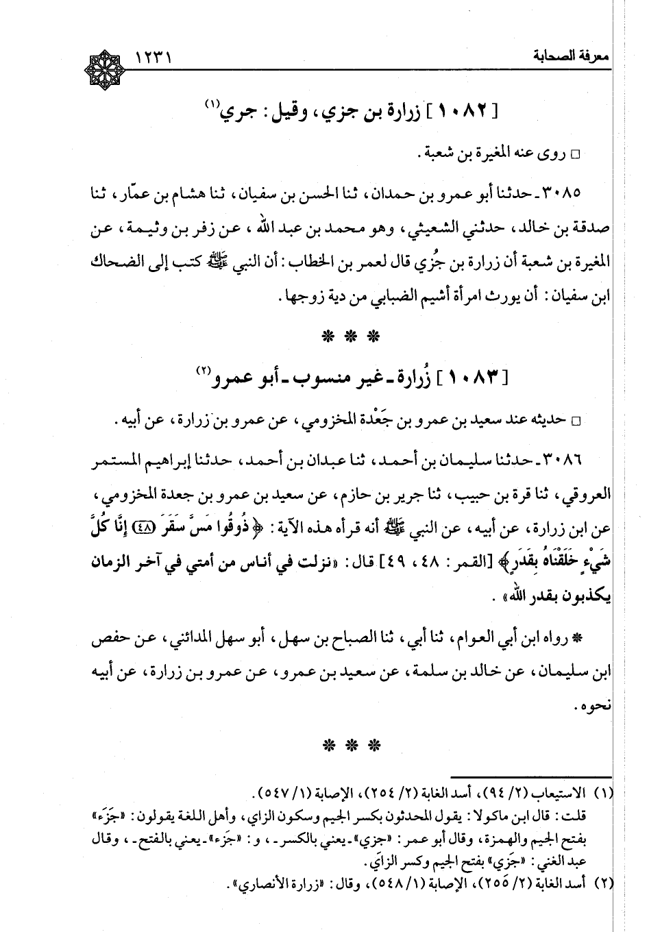 ٣٠٨٦ - حَدَّثَنَا سُلَيْمَانُ بْنُ أَحْمَدَ، ثنا عَبْدَانُ بْنُ أَحْمَدَ، حَدَّثَنَا إِبْرَاهِيمُ الْمُسْتَمِرُّ الْعُرُوقِيُّ، ثنا قُرَّةُ بْنُ حَبِيبٍ، ثنا جَرِيرُ بْنُ حَازِمٍ، عَنْ سَعِيدِ بْنِ عَمْرِو بْنِ جَعْدَةَ الْمَخْزُومِيِّ، عَنِ ابْنِ زُرَارَةَ، عَنْ أَبِيهِ، عَنِ النَّبِيِّ صَلَّى اللَّهُ عَلَيْهِ وَسَلَّمَ أَنَّهُ قَرَّأَهُ هَذِهِ الْآيَةَ: {ذُوقُوا مَسَّ سَقَرَ إِنَّا كُلَّ شَيْءٍ خَلَقْنَاهُ بِقَدْرٍ} [القمر: ٤٩] ، قَالَ: «نَزَلَتْ فِي أُنَاسٍ مِنْ أُمَّتِي فِي آخِرِ الزَّمَانِ يُكَذِّبُونَ بِقَدَرِ اللهِ» رَوَاهُ ابْنُ أَبِي الْعَوَّامِ، ثنا أَبِي، ثنا الصَّبَّاحُ بْنُ سَهْلٍ أَبُو سَهْلٍ الْمَدَائِنِيُّ، عَنْ حَفْصِ بْنِ سُلَيْمَانَ، عَنْ خَالِدِ بْنِ سَلَمَةَ، عَنْ سَعِيدِ بْنِ عَمْرٍو، عَنْ عَمْرِو بْنِ زُرَارَةَ، عَنْ أَبِيهِ نَحْوَهُ