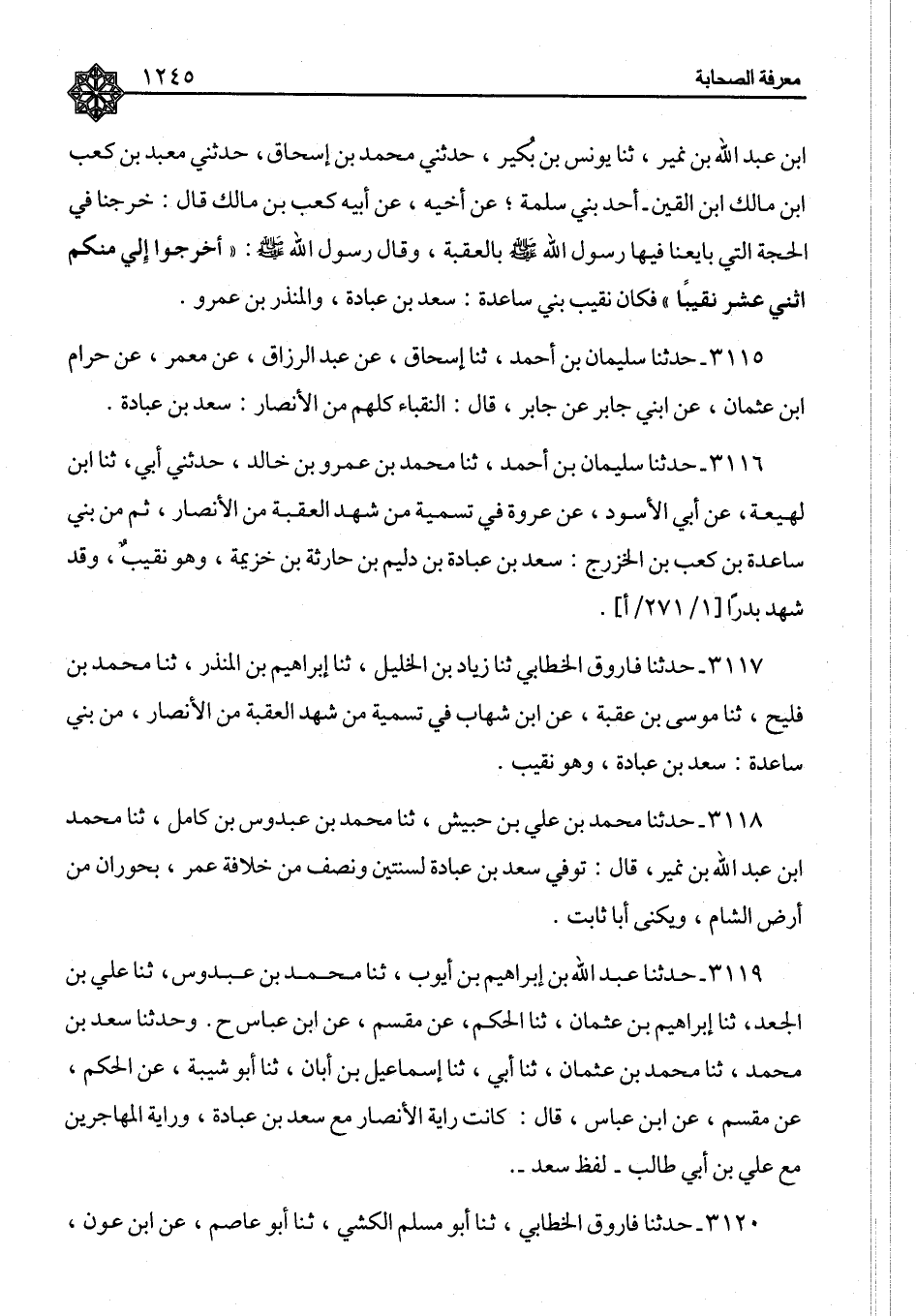 ٣١١٧ - حَدَّثَنَا فَارُوقٌ الْخَطَّابِيُّ، ثنا زِيَادُ بْنُ الْخَلِيلِ، ثنا إِبْرَاهِيمُ بْنُ الْمُنْذِرِ، ثنا مُحَمَّدُ بْنُ فُلَيْحٍ، ثنا مُوسَى بْنُ عُقْبَةَ، عَنِ ابْنِ شِهَابٍ، فِي تَسْمِيَةِ مَنْ شَهِدَ الْعَقَبَةَ مِنَ الْأَنْصَارِ، مِنْ بَنِي سَاعِدَةَ: سَعْدُ بْنُ عُبَادَةَ، وَهُوَ نَقِيبٌ