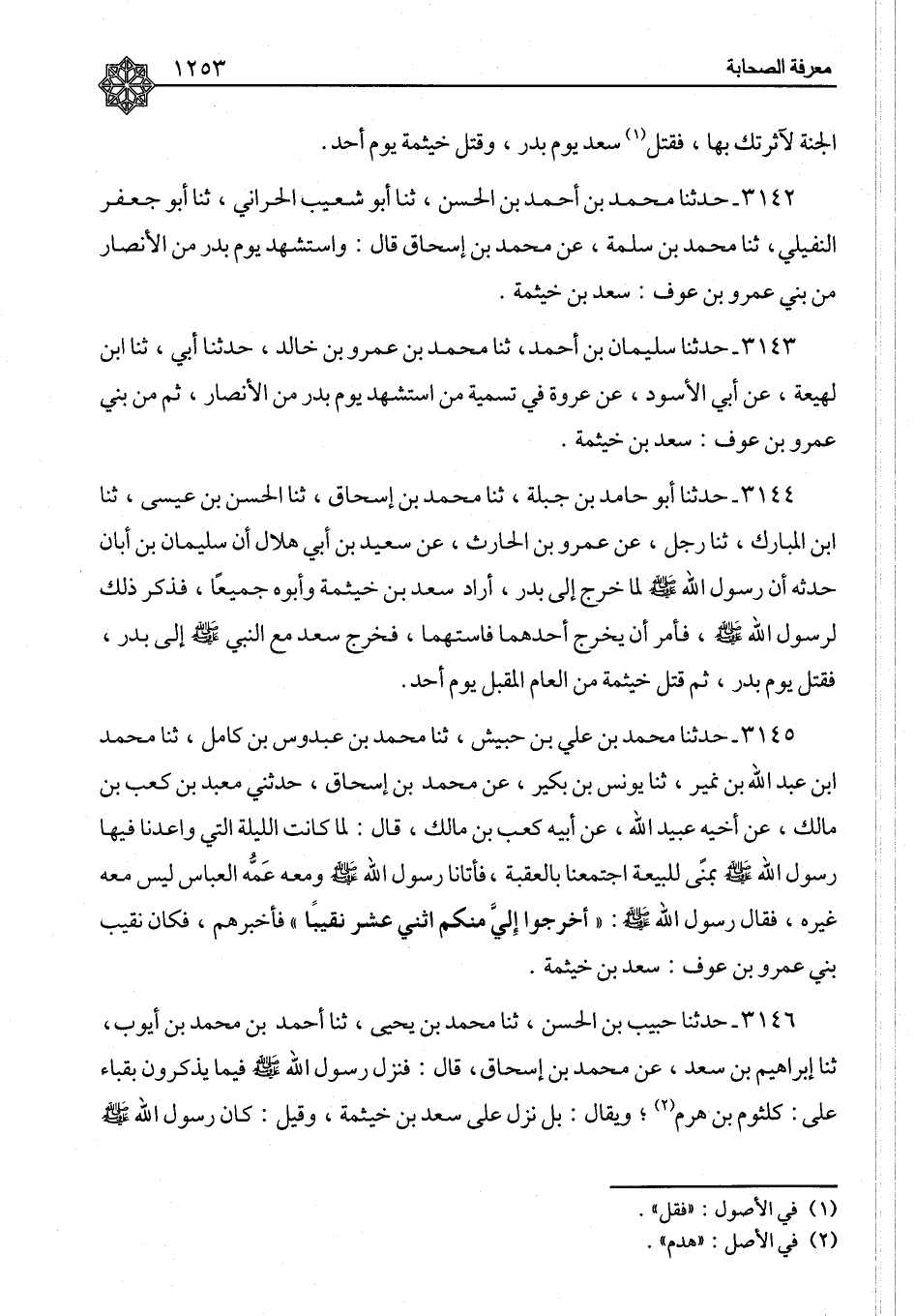 ٣١٤٢ - حَدَّثَنَا مُحَمَّدُ بْنُ أَحْمَدَ بْنِ الْحَسَنِ، ثنا أَبُو شُعَيْبٍ الْحَرَّانِيُّ، ثنا أَبُو جَعْفَرٍ النُّفَيْلِيُّ، ثنا مُحَمَّدُ بْنُ سَلَمَةَ، عَنْ مُحَمَّدِ بْنِ إِسْحَاقَ، قَالَ: وَاسْتُشْهِدَ يَوْمَ بَدْرٍ مِنَ الْأَنْصَارِ مِنْ بَنِي عَمْرِو بْنِ عَوْفٍ سَعْدُ بْنُ خَيْثَمَةَ