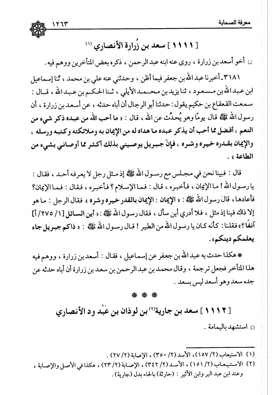٣١٨١ - أَخْبَرَنَا عَبْدُ اللهِ بْنُ جَعْفَرٍ، فِيمَا أَظُنُّ، وَحَدَّثَنِي عَنْهُ عَلِيُّ بْنُ مُحَمَّدٍ، ثنا إِسْمَاعِيلُ بْنُ عَبْدِ اللهِ بْنِ مَسْعُودٍ، ثنا يَزِيدُ بْنُ مُحَمَّدٍ الْأَيْلِيُّ، ثنا الْحَكَمُ بْنُ عَبْدِ اللهِ، قَالَ: سَمِعْتُ الْقَعْقَاعَ بْنَ حَكِيمٍ، يَقُولُ: حَدَّثَنَا أَبُو الرِّجَالِ، أَنَّ أَبَاهُ، حَدَّثَهُ عَنْ أَسْعَدَ بْنِ زُرَارَةَ، أَنَّ رَسُولَ اللهِ صَلَّى اللَّهُ عَلَيْهِ وَسَلَّمَ قَالَ يَوْمًا: وَهُوَ يُحَدِّثُ عَنِ اللهِ قَالَ: «مَا أَحَبَّ اللهُ مِنْ عَبْدِهِ ذِكْرَ شَيْءٍ مِنَ النِّعَمِ أَفْضَلَ مِمَّا أَحَبَّ أَنْ يَذْكُرَ عَبْدُهُ مَا هَدَاهُ لَهُ مِنَ الْإِيمَانِ بِهِ وَمَلَائِكَتَهُ وَكُتُبَهُ وَرُسُلَهُ، وَالْإِيمَانَ بِقَدَرِهِ خَيْرِهِ وَشَرِّهِ، فَإِنَّ جِبْرِيلَ يُوصِينِي بِذَلِكَ أَكْثَرَ مِمَّا أَوْصَانِي بِشَيْءٍ مِنَ الطَّاعَةِ» . قَالَ: فَبَيْنَا نَحْنُ فِي مَجْلِسٍ مَعَ رَسُولِ اللهِ صَلَّى اللَّهُ عَلَيْهِ وَسَلَّمَ إِذْ مَثُلَ رَجُلٌ لَا يَعْرِفُهُ أَحَدٌ فَقَالَ: يَا رَسُولَ اللهِ، مَا الْإِيمَانُ؟ فَأَخْبَرَهُ قَالَ: فَمَا الْإِسْلَامُ؟ فَأَخْبَرَهُ فَقَالَ: فَمَا الْإِيمَانُ؟ فَأَعَادَهَا قَالَ رَسُولُ اللهِ صَلَّى اللَّهُ عَلَيْهِ وَسَلَّمَ: " الْإِيمَانُ: الْإِيمَانُ بِالْقَدَرِ خَيْرِهِ وَشَرِّهِ " فَقَالَ الرَّجُلُ: مَا هُوَ إِلَّا ذَاكَ فِينَا إِذَا مَثُلَ فِينَا، فَلَا أَدْرِي أَيْنَ سَأَلَ فَقَالَ رَسُولُ اللهِ صَلَّى اللَّهُ عَلَيْهِ وَسَلَّمَ: «أَيْنَ السَّائِلُ آنِفًا؟» فَقُلْنَا: كَأَنَّهُ كَانَ يَا رَسُولَ اللهِ مِنَ الطَّيْرِ، قَالَ رَسُولُ اللهِ صَلَّى اللَّهُ عَلَيْهِ وَسَلَّمَ: «ذَاكُمْ جِبْرِيلُ جَاءَ يُعَلِّمُكُمْ دِينَكُمْ» هَكَذَا حَدَّثَ بِهِ عَبْدُ اللهِ بْنُ جَعْفَرٍ عَنْ إِسْمَاعِيلَ فَقَالَ أَسْعَدُ بْنُ زُرَارَةَ، وَوَهِمَ فِيهِ هَذَا الْمُتَأَخِّرُ فَجُعِلَ تَرْجَمَةً وَقَالَ مُحَمَّدُ بْنُ عَبْدِ الرَّحْمَنِ بْنِ سَعْدِ بْنِ زُرَارَةَ إِنَّ أَبَاهُ حَدَّثَهُ عَنْ جَدِّهِ سَعْدٍ، وَهُوَ أَسْعَدُ لَيْسَ بِسَعْدٍ