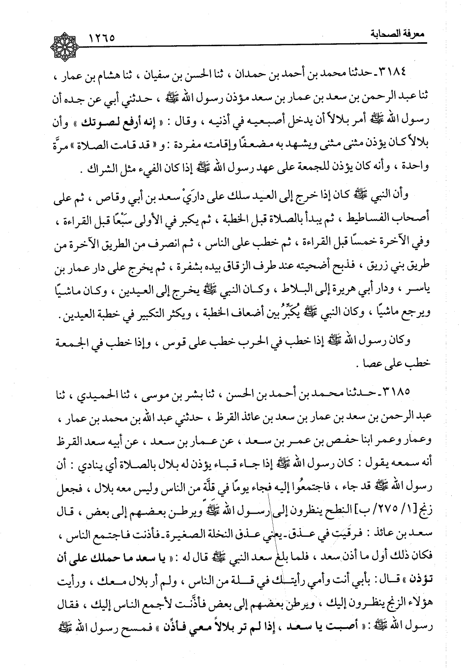 ٣١٨٤ - حَدَّثَنَا مُحَمَّدُ بْنُ أَحْمَدَ بْنِ حَمْدَانَ، ثنا الْحَسَنُ بْنُ سُفْيَانَ، ثنا هِشَامُ بْنُ عَمَّارٍ، ثنا عَبْدُ الرَّحْمَنِ بْنُ سَعْدِ بْنِ عَمَّارِ بْنِ سَعْدٍ، مُؤَذِّنِ رَسُولِ اللهِ صَلَّى اللَّهُ عَلَيْهِ وَسَلَّمَ، حَدَّثَنِي أَبِي عَنْ جَدِّهِ أَنَّ رَسُولَ اللهِ صَلَّى اللَّهُ عَلَيْهِ وَسَلَّمَ أَمَرَ بِلَالًا أَنْ يُدْخِلَ أُصْبُعَيْهِ فِي أُذُنَيْهِ، وَقَالَ: «إِنَّهُ أَرْفَعُ لِصَوْتِكَ» وَأَنَّ بِلَالًا كَانَ يُؤَذِّنُ مَثْنَى مَثْنَى وَيَشْهَدُ بِهِ مُضَعَّفًا وَإِقَامَتُهُ مُفْرَدَةٌ: وَ «قَدْ قَامَتِ الصَّلَاةُ» مَرَّةً وَاحِدَةً، وَأَنَّهُ كَانَ يُؤَذِّنُ لِلْجُمُعَةِ عَلَى عَهْدِ رَسُولِ اللهِ صَلَّى اللَّهُ عَلَيْهِ وَسَلَّمَ إِذَا كَانَ الْفَيْءُ مِثْلَ الشِّرَاكِ. وَأَنَّ النَّبِيَّ صَلَّى اللَّهُ عَلَيْهِ وَسَلَّمَ كَانَ إِذَا خَرَجَ إِلَى الْعِيدِ سَلَكَ عَلَى دَارَيْ سَعْدِ بْنِ أَبِي وَقَّاصٍ، ثُمَّ عَلَى أَصْحَابِ الْفَسَاطِيطِ، ثُمَّ يَبْدَأُ بِالصَّلَاةِ قَبْلَ الْخُطْبَةِ، ثُمَّ يُكَبِّرُ فِي الْأُولَى سَبْعًا قَبْلَ الْقِرَاءَةِ، وَفِي الْآخِرَةِ خَمْسًا قَبْلَ الْقِرَاءَةِ، ثُمَّ خَطَبَ عَلَى النَّاسِ، ثُمَّ انْصَرَفَ مِنَ الطَّرِيقِ الْآخِرَةِ مِنْ طَرِيقِ بَنِي زُرَيْقٍ، فَذَبَحَ أُضْحِيَّتَهُ عِنْدَ طَرَفِ الزِّقَاقِ بِيَدِهِ بِشَفْرَةٍ، ثُمَّ يَخْرُجُ عَلَى دَارِ عَمَّارِ بْنِ يَاسِرٍ، وَدَارِ أَبِي هُرَيْرَةَ إِلَى الْبَلَاطِ، وَكَانَ النَّبِيُّ صَلَّى اللَّهُ عَلَيْهِ وَسَلَّمَ يَخْرُجُ إِلَى الْعِيدَيْنِ، وَكَانَ مَاشِيًا وَيَرْجِعُ مَاشِيًا، وَكَانَ النَّبِيُّ صَلَّى اللَّهُ عَلَيْهِ وَسَلَّمَ يُكَبِّرُ بَيْنَ أَضْعَافِ الْخُطْبَةِ، وَيُكْثِرُ التَّكْبِيرَ فِي خُطْبَةِ الْعِيدَيْنِ، وَكَانَ رَسُولُ اللهِ صَلَّى اللَّهُ عَلَيْهِ وَسَلَّمَ إِذَا خَطَبَ فِي الْحَرْبِ خَطَبَ عَلَى قَوْسٍ، وَإِذَا خَطَبَ فِي الْجُمُعَةِ خَطَبَ عَلَى عَصًا