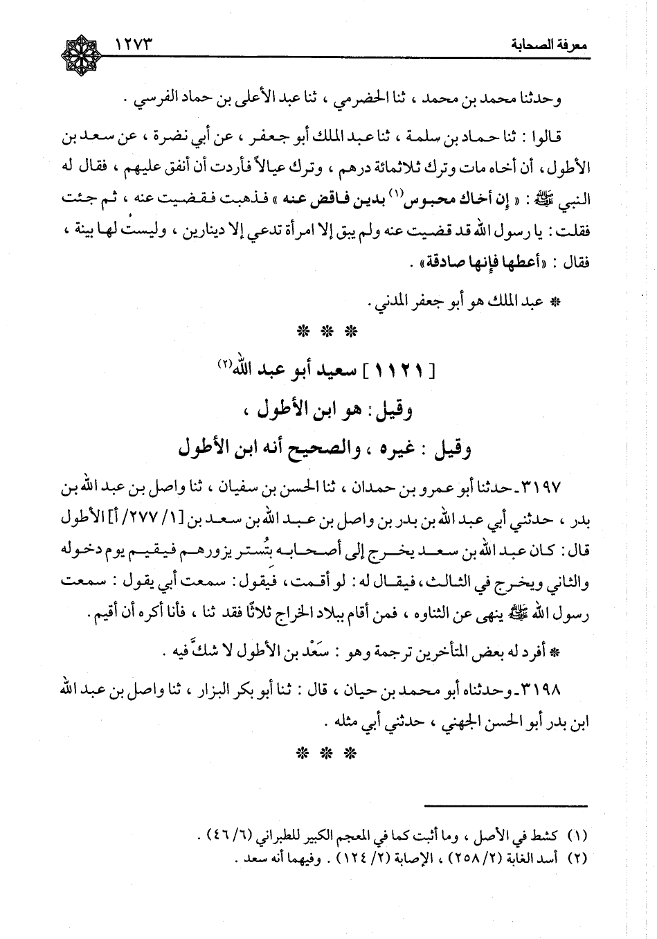 ٣١٩٧ - حَدَّثَنَا أَبُو عَمْرِو بْنُ حَمْدَانَ، ثنا الْحَسَنُ بْنُ سُفْيَانَ، ثنا وَاصِلُ بْنُ عَبْدِ اللهِ بْنِ بَدْرٍ، حَدَّثَنِي أَبِي عَبْدُ اللهِ بْنُ بَدْرِ بْنِ وَاصِلِ بْنِ عَبْدِ اللهِ بْنِ سَعْدِ بْنِ الْأَطْوَلِ، قَالَ: كَانَ عَبْدُ اللهِ بْنُ سَعْدٍ يَخْرُجُ إِلَى أَصْحَابِهِ بِتُسْتَرَ يَزُورُهُمْ فَيُقِيمُ يَوْمَ دُخُولِهِ وَالثَّانِي وَيَخْرُجُ فِي الثَّالِثِ، فَيُقَالُ لَهُ: لَوْ أَقَمْتَ، فَيَقُولُ: سَمِعْتُ أَبِي يَقُولُ: سَمِعْتُ رَسُولَ اللهِ صَلَّى اللَّهُ عَلَيْهِ وَسَلَّمَ يَنْهَى عَنِ الثَّنَاوَةِ، فَمَنْ أَقَامَ بِبِلَادِ الْخَرَاجِ ثَلَاثًا فَقَدْ ثَنَّا، فَأَنَا أَكْرَهُ أَنْ أُقِيمَ أَفْرَدَ لَهُ بَعْضُ الْمُتَأَخِّرِينَ تَرْجَمَةً وَهُوَ: سَعْدُ بْنُ الْأَطْوَلِ لَا شَكَّ فِيهِ