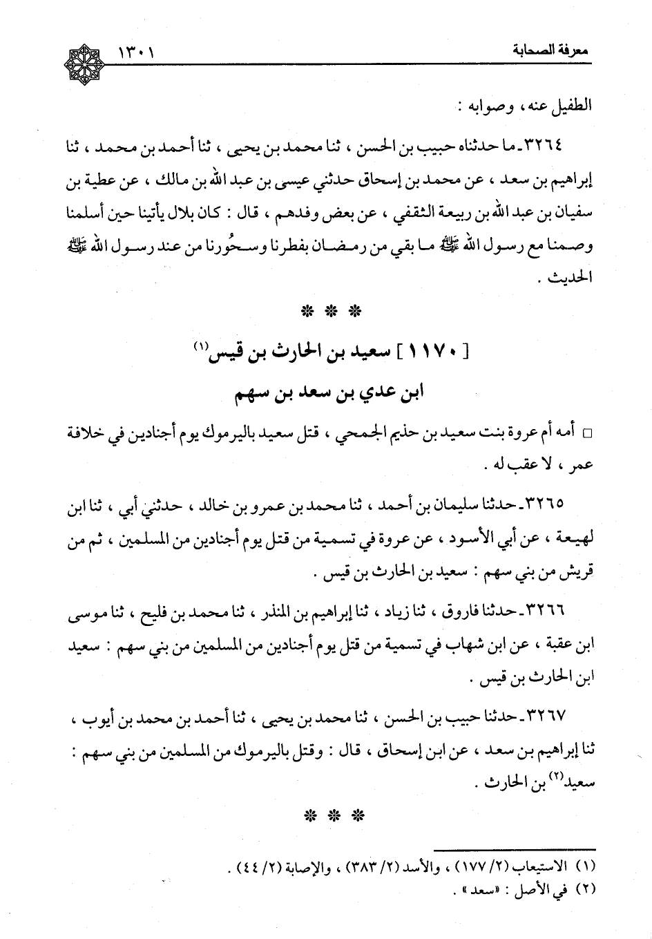٣٢٦٧ - حَدَّثَنَا حَبِيبُ بْنُ الْحَسَنِ، ثنا مُحَمَّدُ بْنُ يَحْيَى، ثنا أَحْمَدُ بْنُ مُحَمَّدِ بْنِ أَيُّوبَ، ثنا إِبْرَاهِيمُ بْنُ سَعْدٍ، عَنِ ابْنِ إِسْحَاقَ، قَالَ: وَقُتِلَ بِالْيَرْمُوكِ مِنَ الْمُسْلِمِينَ مِنْ بَنِي سَهْمٍ: سَعِيدُ بْنُ الْحَارِثِ "