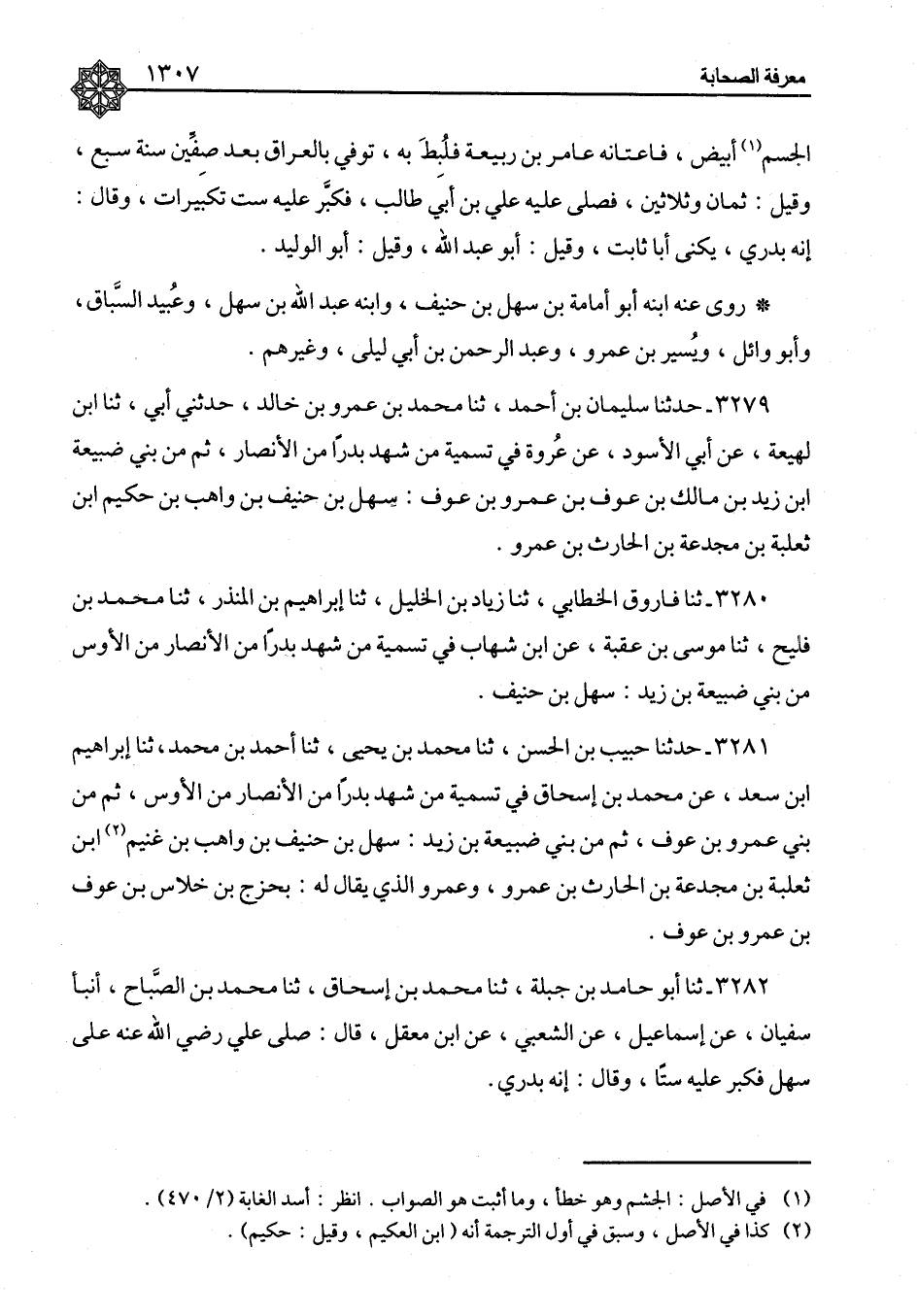 ٣٢٨٠ - ثنا فَارُوقٌ الْخَطَّابِيُّ، ثنا زِيَادُ بْنُ الْخَلِيلِ، ثنا إِبْرَاهِيمُ بْنُ الْمُنْذِرِ، ثنا مُحَمَّدُ بْنُ فُلَيْحٍ، ثنا مُوسَى بْنُ عُقْبَةَ، عَنِ ابْنِ شِهَابٍ، فِي تَسْمِيَةِ مَنْ شَهِدَ بَدْرًا مِنَ الْأَنْصَارِ مِنَ الْأَوْسِ مِنْ بَنِي ضُبَيْعَةَ بْنِ زَيْدٍ: سَهْلُ بْنُ حُنَيْفٍ "