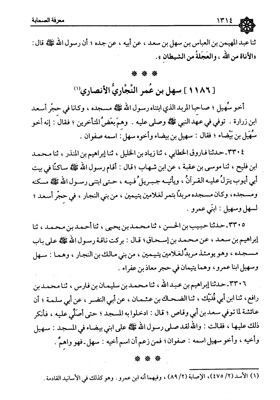 سَهْلُ بْنُ عُمَرَ النَّجَّارِيُّ الْأَنْصَارِيُّ أَخُو سُهَيْلٍ، صَاحِبَا الْمِرْبَدِ الَّذِي ابْتَنَاهُ رَسُولُ اللهِ صَلَّى اللَّهُ عَلَيْهِ وَسَلَّمَ مَسْجِدَهُ، وَكَانَا فِي حَجْرِ أَسْعَدَ بْنِ زُرَارَةَ تُوُفِّيَ فِي عَهْدِ النَّبِيِّ صَلَّى اللَّهُ عَلَيْهِ وَسَلَّمَ وَصَلَّى عَلَيْهِ، وَهِمَ بَعْضُ الْمُتَأَخِّرِينَ فَقَالَ: إِنَّهُ أَخُو سُهَيْلِ ابْنِ بَيْضَاءَ فَقَالَ: سُهَيْلُ ابْنُ بَيْضَاءَ وَأَخُوهُ سَهْلٌ: اسْمُهُ صَفْوَانُ