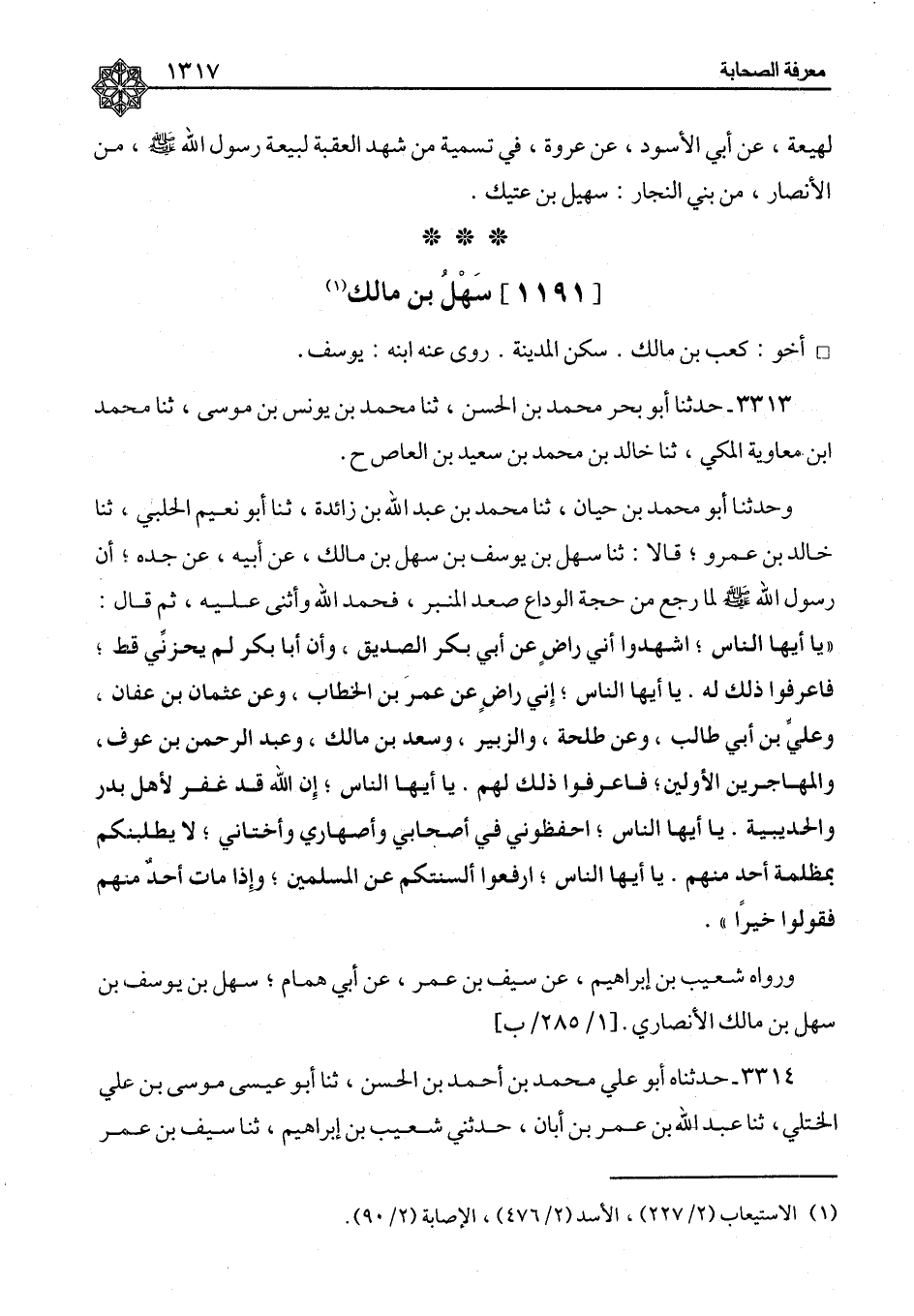 ٣٣١٣ - حَدَّثَنَا أَبُو بَحْرٍ مُحَمَّدُ بْنُ الْحَسَنِ، ثنا مُحَمَّدُ بْنُ يُونُسَ بْنِ مُوسَى، ثنا مُحَمَّدُ بْنُ مُعَاوِيَةَ الْمَكِّيُّ، ثنا خَالِدُ بْنُ مُحَمَّدِ بْنِ سَعِيدِ بْنِ الْعَاصِ، ح وَحَدَّثَنَا أَبُو مُحَمَّدِ بْنُ حَيَّانَ، ثنا مُحَمَّدُ بْنُ عَبْدِ اللهِ بْنِ زَائِدَةَ، ثنا أَبُو نُعَيْمٍ الْحَلَبِيُّ، ثنا خَالِدُ بْنُ عَمْرٍو، قَالَا: ثنا سَهْلُ بْنُ يُوسُفَ بْنِ سَهْلِ بْنِ مَالِكٍ، عَنْ أَبِيهِ، عَنْ جَدِّهِ، أَنَّ رَسُولَ اللهِ صَلَّى اللَّهُ عَلَيْهِ وَسَلَّمَ لَمَّا رَجَعَ مِنْ حَجَّةِ الْوَدَاعِ صَعِدَ الْمِنْبَرَ، فَحَمِدَ اللهَ وَأَثْنَى عَلَيْهِ، ثُمَّ قَالَ: «يَا أَيُّهَا النَّاسُ، اشْهَدُوا أَنِّي رَاضٍ عَنْ أَبِي بَكْرٍ الصِّدِّيقِ، وَأَنَّ أَبَا بَكْرٍ لَمْ يُحْزِنِّي قَطُّ، فَاعْرِفُوا ذَلِكَ لَهُ، يَا أَيُّهَا النَّاسُ، إِنِّي رَاضٍ عَنْ عُمَرَ بْنِ الْخَطَّابِ، وَعَنْ عُثْمَانَ بْنِ عَفَّانَ، وَعَلِيِّ بْنِ أَبِي طَالِبٍ، وَعَنْ طَلْحَةَ، وَالزُّبَيْرِ، وَسَعْدِ بْنِ مَالِكٍ، وَعَبْدِ الرَّحْمَنِ بْنِ عَوْفٍ، وَالْمُهَاجِرِينَ الْأَوَّلِينَ، فَاعْرِفُوا ذَلِكَ لَهُمْ، يَا أَيُّهَا النَّاسُ، إِنَّ اللهَ قَدْ غَفَرَ لِأَهْلِ بَدْرٍ وَالْحُدَيْبِيَةِ، يَا أَيُّهَا النَّاسُ، احْفَظُونِي فِي أَصْحَابِي وَأَصْهَارِي وَأَخْتَانِي، لَا يَطْلُبَنَّكُمْ بِمَظْلِمَةٍ أَحَدٍ مِنْهُمْ، يَا أَيُّهَا النَّاسُ، ارْفَعُوا أَلْسِنَتَكُمْ عَنِ الْمُسْلِمِينَ، وَإِذَا مَاتَ أَحَدٌ مِنْهُمْ فَقُولُوا خَيْرًا» وَرَوَاهُ شُعَيْبُ بْنُ إِبْرَاهِيمَ، عَنْ سَيْفِ بْنِ عُمَرَ، عَنْ أَبِي هَمَّامٍ سَهْلِ بْنِ يُوسُفَ بْنِ سَهْلِ بْنِ مَالِكٍ الْأَنْصَارِيِّ