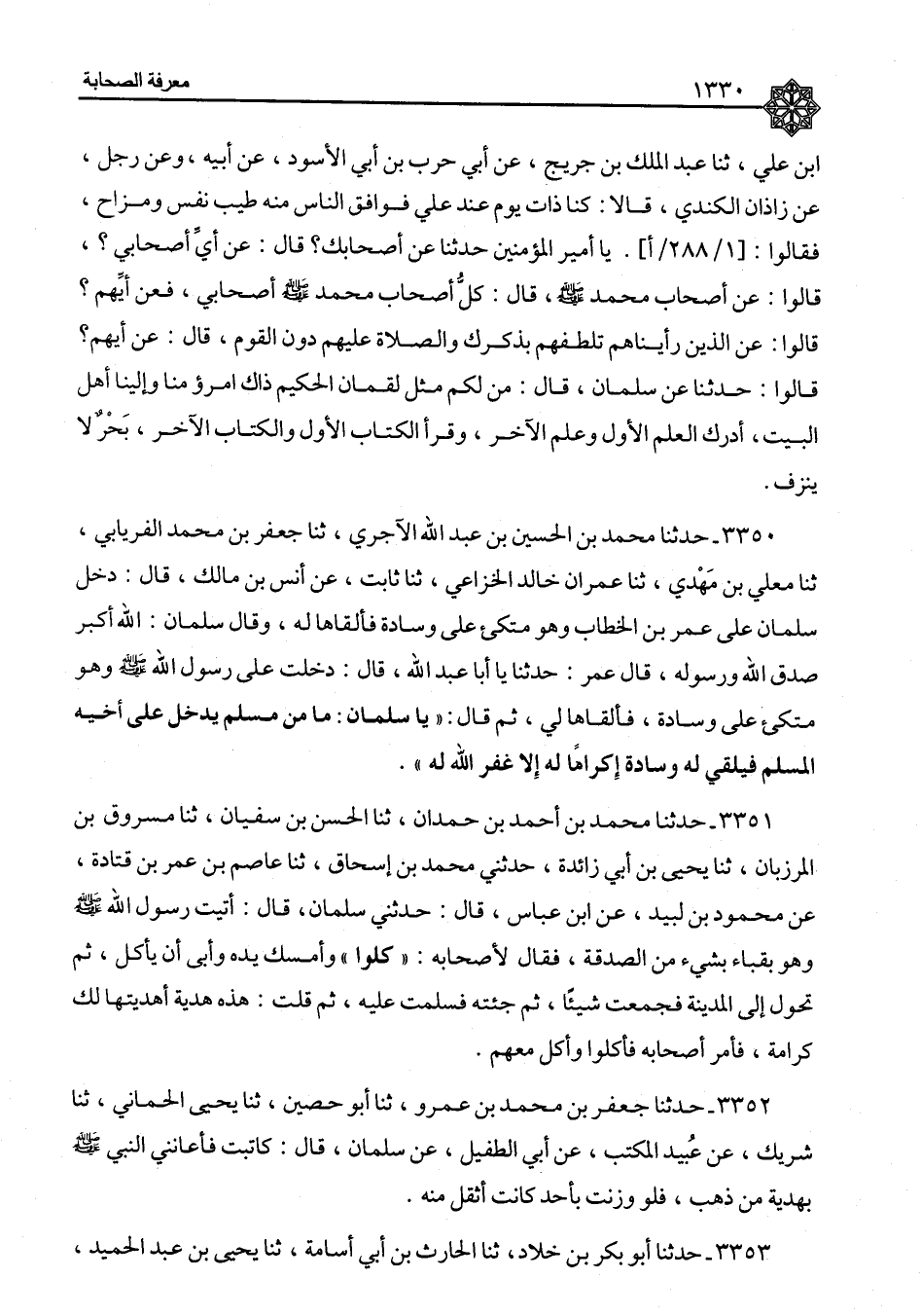 ٣٣٥٠ - حَدَّثَنَا مُحَمَّدُ بْنُ الْحُسَيْنِ بْنِ عَبْدِ اللهِ الْآجُرِّيُّ، ثنا جَعْفَرُ بْنُ مُحَمَّدٍ الْفِرْيَابِيُّ، ثنا مُعَلَّى بْنُ مَهْدِيٍّ، ثنا عِمْرَانُ: خَالِدٌ الْخُزَاعِيُّ، ثنا ثَابِتٌ، عَنْ أَنَسِ بْنِ مَالِكٍ، قَالَ: دَخَلَ سَلْمَانُ عَلَى عُمَرَ بْنِ الْخَطَّابِ وَهُوَ مُتَّكِئٌ عَلَى وِسَادَةٍ فَأَلْقَاهَا لَهُ، وَقَالَ سَلْمَانُ: اللهُ أَكْبَرُ صَدَقَ اللهُ وَرَسُولُهُ، قَالَ عُمَرُ: حَدِّثْنَا يَا أَبَا عَبْدِ اللهِ قَالَ: دَخَلْتُ عَلَى رَسُولِ اللهِ صَلَّى اللَّهُ عَلَيْهِ وَسَلَّمَ وَهُوَ مُتَّكِئٌ عَلَى وِسَادَةٍ، فَأَلْقَاهَا لِي، ثُمَّ قَالَ: " يَا سَلْمَانُ: مَا مِنْ مُسْلِمٍ يَدْخُلُ عَلَى أَخِيهِ الْمُسْلِمِ فَيُلْقِي لَهُ وِسَادَةً إِكْرَامًا لَهُ إِلَّا غَفَرَ اللهُ لَهُ "