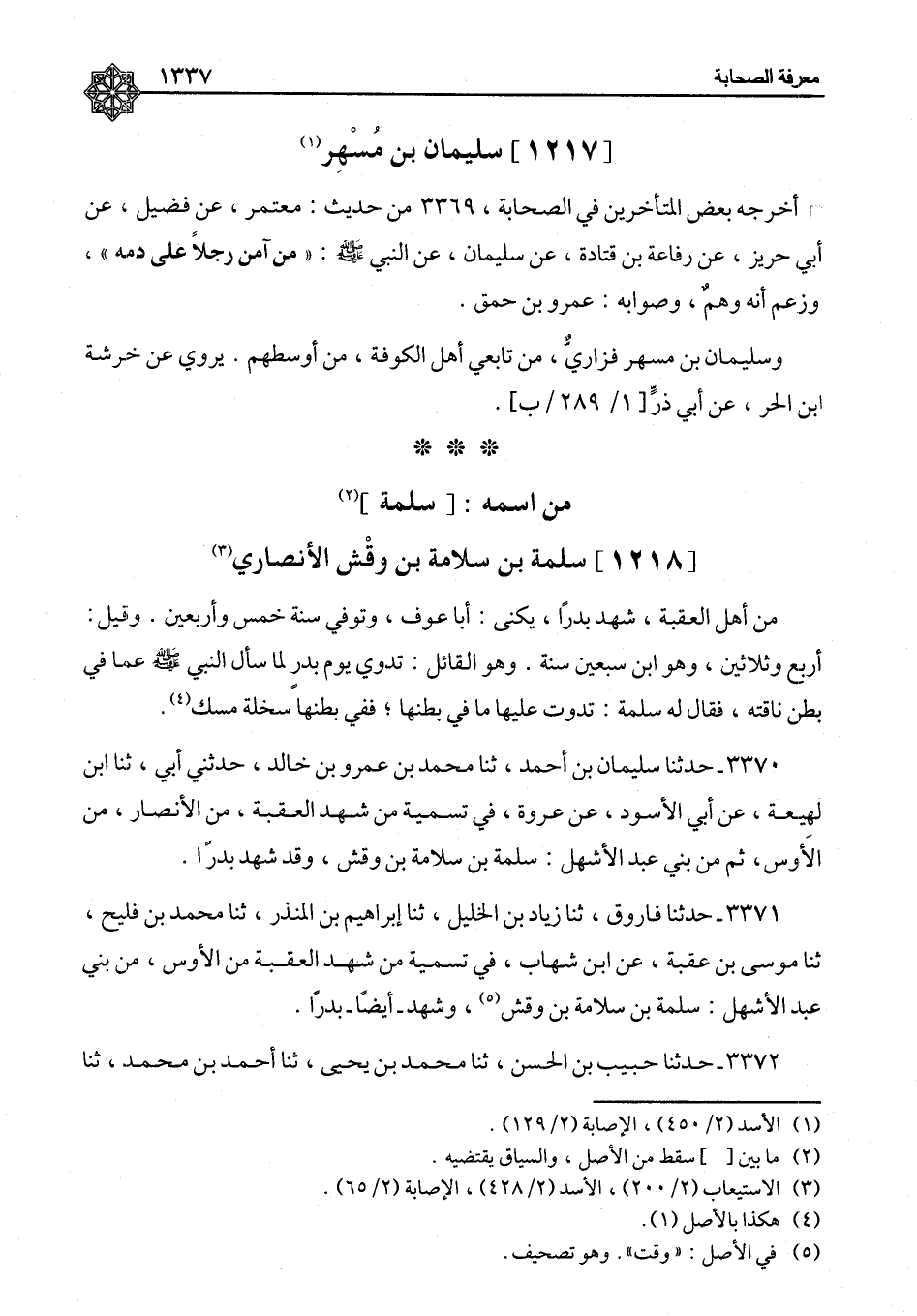 ٣٣٧١ - حَدَّثَنَا فَارُوقٌ، ثنا زِيَادُ بْنُ الْخَلِيلِ، ثنا إِبْرَاهِيمُ بْنُ الْمُنْذِرِ، ثنا مُحَمَّدُ بْنُ فُلَيْحٍ، ثنا مُوسَى بْنُ عُقْبَةَ، عَنِ ابْنِ شِهَابٍ، فِي تَسْمِيَةِ مَنْ شَهِدَ الْعَقَبَةَ مِنَ الْأَوْسِ، مِنْ بَنِي عَبْدِ الْأَشْهَلِ: سَلَمَةُ بْنُ سَلَامَةَ بْنِ وَقْشٍ، وَشَهِدَ أَيْضًا بَدْرًا