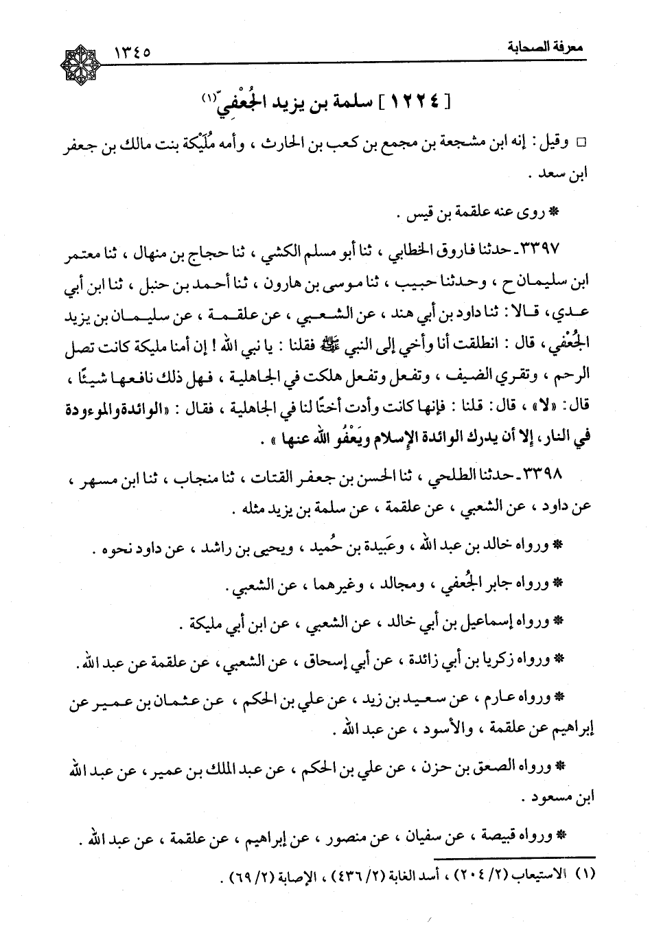 ٣٣٩٧ - حَدَّثَنَا فَارُوقٌ الْخَطَّابِيُّ، ثنا أَبُو مُسْلِمٍ الْكَشِّيُّ، ثنا حَجَّاجُ بْنُ مِنْهَالٍ، ثنا مُعْتَمِرُ بْنُ سُلَيْمَانَ، ح وَحَدَّثَنَا حَبِيبٌ، ثنا مُوسَى بْنُ هَارُونَ، ثنا أَحْمَدُ بْنُ حَنْبَلٍ، ثنا ابْنُ أَبِي عَدِيٍّ، قَالَا: ثنا دَاوُدُ بْنُ أَبِي هِنْدٍ، عَنِ الشَّعْبِيِّ، عَنْ عَلْقَمَةَ، عَنْ سَلَمَةَ بْنِ يَزِيدَ الْجُعْفِيِّ، قَالَ: انْطَلَقْتُ أَنَا وَأَخِي، إِلَى النَّبِيِّ صَلَّى اللَّهُ عَلَيْهِ وَسَلَّمَ فَقُلْنَا: يَا نَبِيَّ اللهِ، إِنَّ أُمَّنَا مُلَيْكَةَ كَانَتْ تَصِلُ الرَّحِمَ، وَتَقْرِي الضَّيْفَ، وَتَفْعَلُ وَتَفْعَلُ هَلَكَتْ فِي الْجَاهِلِيَّةِ، فَهَلْ ذَلِكَ نَافِعُهَا شَيْئًا؟ قَالَ: «لَا» قَالَ: قُلْنَا: فَإِنَّهَا كَانَتْ وَأَدَتْ أُخْتًا لَنَا فِي الْجَاهِلِيَّةِ فَقَالَ: «الْوَائِدَةُ وَالْمَوْءُودَةُ فِي النَّارِ، إِلَّا أَنْ يُدْرِكَ الْوَائِدَةَ الْإِسْلَامُ وَيَعْفُوَ اللهُ عَنْهَا»