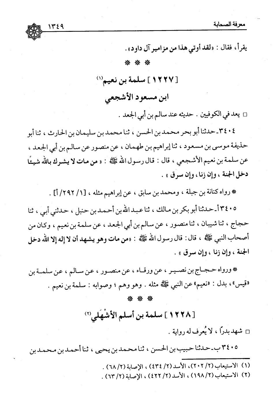 ٣٤٠٤ - حَدَّثَنَا أَبُو بَحْرٍ مُحَمَّدُ بْنُ الْحَسَنِ، ثنا مُحَمَّدُ بْنُ سُلَيْمَانَ بْنِ الْحَارِثِ، ثنا أَبُو حُذَيْفَةَ مُوسَى بْنُ مَسْعُودٍ، ثنا إِبْرَاهِيمُ بْنُ طَهْمَانَ، عَنْ مَنْصُورٍ، عَنْ سَالِمِ بْنِ أَبِي الْجَعْدِ، عَنْ سَلَمَةَ بْنِ نُعَيْمٍ الْأَشْجَعِيِّ، قَالَ: قَالَ رَسُولُ اللهِ صَلَّى اللَّهُ عَلَيْهِ وَسَلَّمَ: «مَنْ مَاتَ لَا يُشْرِكُ بِاللهِ شَيْئًا دَخَلَ الْجَنَّةَ، وَإِنْ زَنَا، وَإِنْ سَرَقَ» رَوَاهُ كِنَانَةُ بْنُ جَبَلَةَ، وَمُحَمَّدُ بْنُ سَابِقٍ، عَنْ إِبْرَاهِيمَ مِثْلَهُ