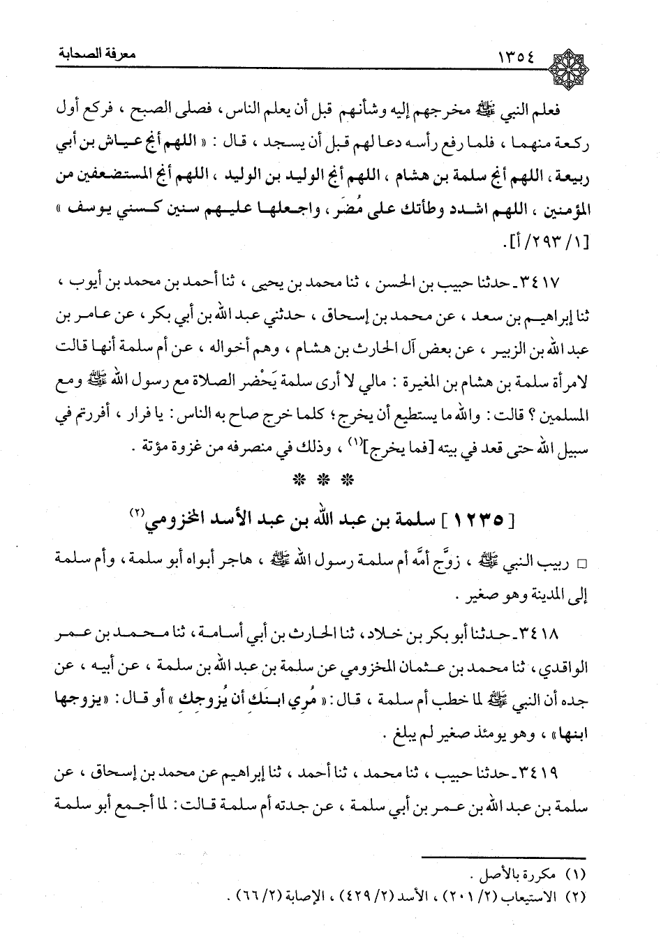٣٤١٧ - حَدَّثَنَا حَبِيبُ بْنُ الْحَسَنِ، ثنا مُحَمَّدُ بْنُ يَحْيَى، ثنا أَحْمَدُ بْنُ مُحَمَّدِ بْنِ أَيُّوبَ، ثنا إِبْرَاهِيمُ بْنُ سَعْدٍ، عَنْ مُحَمَّدِ بْنِ إِسْحَاقَ، حَدَّثَنِي عَبْدُ اللهِ بْنُ أَبِي بَكْرٍ، عَنْ عَامِرِ بْنِ عَبْدِ اللهِ بْنِ الزُّبَيْرِ، عَنْ بَعْضِ آلِ الْحَارِثِ بْنِ هِشَامٍ، وَهُمْ أَخْوَالُهُ، عَنْ أُمِّ سَلَمَةَ، أَنَّهَا قَالَتْ لِامْرَأَةِ سَلَمَةَ بْنِ هِشَامِ بْنِ الْمُغِيرَةِ: " مَا لِي لَا أَرَى سَلَمَةَ يَحْضُرُ الصَّلَاةَ مَعَ رَسُولِ اللهِ صَلَّى اللَّهُ عَلَيْهِ وَسَلَّمَ وَمَعَ الْمُسْلِمِينَ؟ قَالَتْ: وَاللهِ مَا يَسْتَطِيعُ أَنْ يَخْرُجَ، كُلَّمَا خَرَجَ صَاحَ بِهِ النَّاسُ: يَا فُرَّارُ، أَفَرَرْتُمْ فِي سَبِيلِ اللهِ حَتَّى قَعَدَ فِي بَيْتِهِ فَمَا يَخْرُجُ، وَذَلِكَ فِي مُنْصَرَفِهِ مِنْ غَزْوَةِ مُؤْتَةَ "