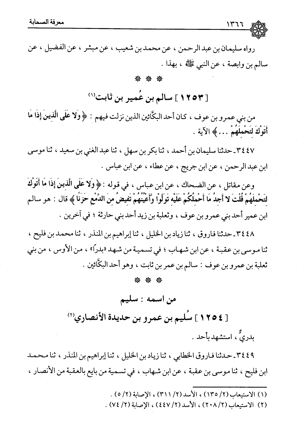 ٣٤٤٨ - حَدَّثَنَا فَارُوقٌ، ثنا زِيَادُ بْنُ الْخَلِيلِ، ثنا إِبْرَاهِيمُ بْنُ الْمُنْذِرِ، ثنا مُحَمَّدُ بْنُ فُلَيْحٍ، ثنا مُوسَى بْنُ عُقْبَةَ، عَنِ ابْنِ شِهَابٍ، فِي تَسْمِيَةِ مَنْ شَهِدَ بَدْرًا، مِنَ الْأَوْسِ، مِنْ بَنِي ثَعْلَبَةَ بْنِ عَمْرِو بْنِ عَوْفٍ: «سَالِمُ بْنُ عُمَرَ بْنِ ثَابِتٍ، وَهُوَ أَحَدُ الْبَكَّائِينَ»