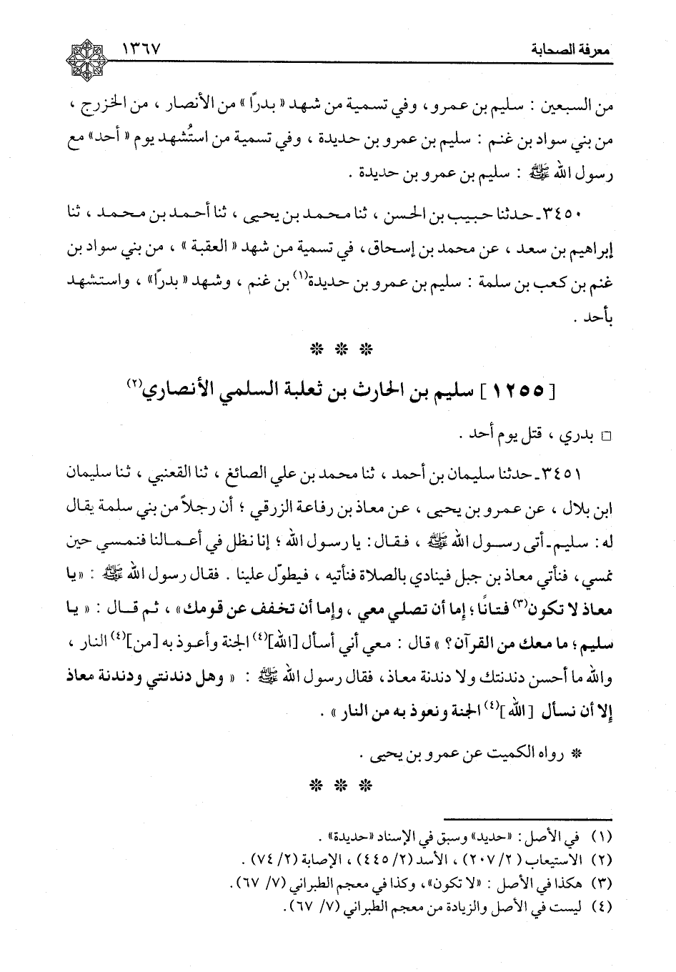٣٤٥٠ - حَدَّثَنَا حَبِيبُ بْنُ الْحَسَنِ، ثنا مُحَمَّدُ بْنُ يَحْيَى، ثنا أَحْمَدُ بْنُ مُحَمَّدٍ، ثنا إِبْرَاهِيمُ بْنُ سَعْدٍ، عَنْ مُحَمَّدِ بْنِ إِسْحَاقَ، فِي تَسْمِيَةِ مَنْ شَهِدَ الْعَقَبَةَ، مِنْ بَنِي سَوَّادِ بْنِ غَنْمِ بْنِ كَعْبِ بْنِ سَلَمَةَ: «سُلَيْمُ بْنُ عَمْرِو بْنِ حَدِيدَةَ بْنِ غَنْمٍ، وَشَهِدَ بَدْرًا، وَاسْتُشْهِدَ بِأُحُدٍ»