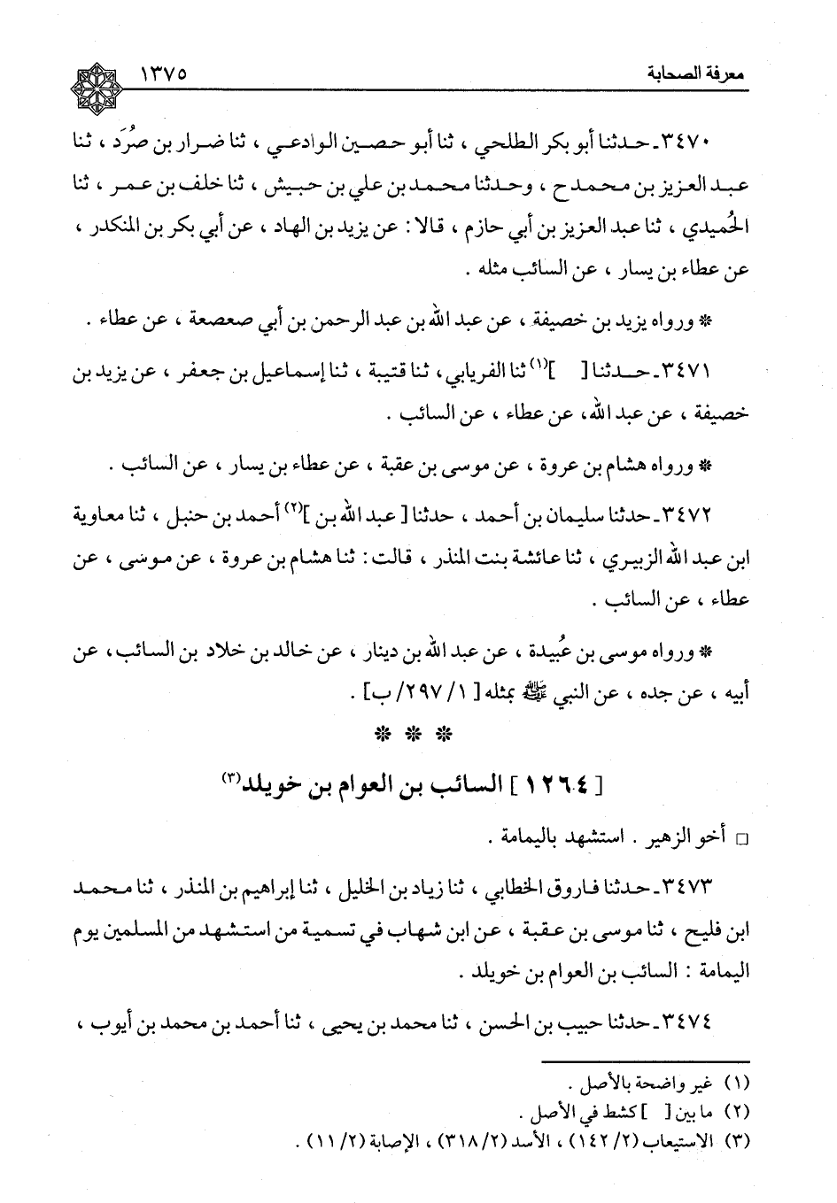 ٣٤٧٣ - حَدَّثَنَا فَارُوقٌ الْخَطَّابِيُّ، ثنا زِيَادُ بْنُ الْخَلِيلِ، ثنا إِبْرَاهِيمُ بْنُ الْمُنْذِرِ، ثنا مُحَمَّدُ بْنُ فُلَيْحٍ، ثنا مُوسَى بْنُ عُقْبَةَ، عَنِ ابْنِ شِهَابٍ، فِي تَسْمِيَةِ مَنِ اسْتُشْهِدَ مِنَ الْمُسْلِمِينَ يَوْمَ الْيَمَامَةِ: «السَّائِبُ بْنُ الْعَوَّامِ بْنِ خُوَيْلِدٍ»