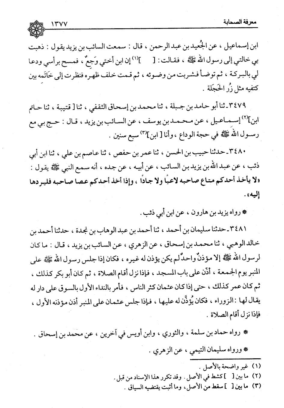 ٣٤٨٠ - حَدَّثَنَا حَبِيبُ بْنُ الْحَسَنِ، ثنا عُمَرُ بْنُ حَفْصٍ، ثنا عَاصِمُ بْنُ عَلِيٍّ، ثنا ابْنُ أَبِي ذِئْبٍ، عَنْ عَبْدِ اللهِ بْنِ يَزِيدَ بْنِ السَّائِبِ، عَنْ أَبِيهِ، عَنْ جَدِّهِ، أَنَّهُ سَمِعَ النَّبِيَّ صَلَّى اللَّهُ عَلَيْهِ وَسَلَّمَ يَقُولُ: «لَا يَأْخُذُ أَحَدُكُمْ مَتَاعَ صَاحِبِهِ لَاعِبًا وَلَا جَادًّا، وَإِذَا أَخَذَ أَحَدُكُمْ عَصَا صَاحِبِهِ فَلْيَرُدَّهَا إِلَيْهِ» رَوَاهُ يَزِيدُ بْنُ هَارُونَ، عَنِ ابْنِ أَبِي ذِئْبٍ