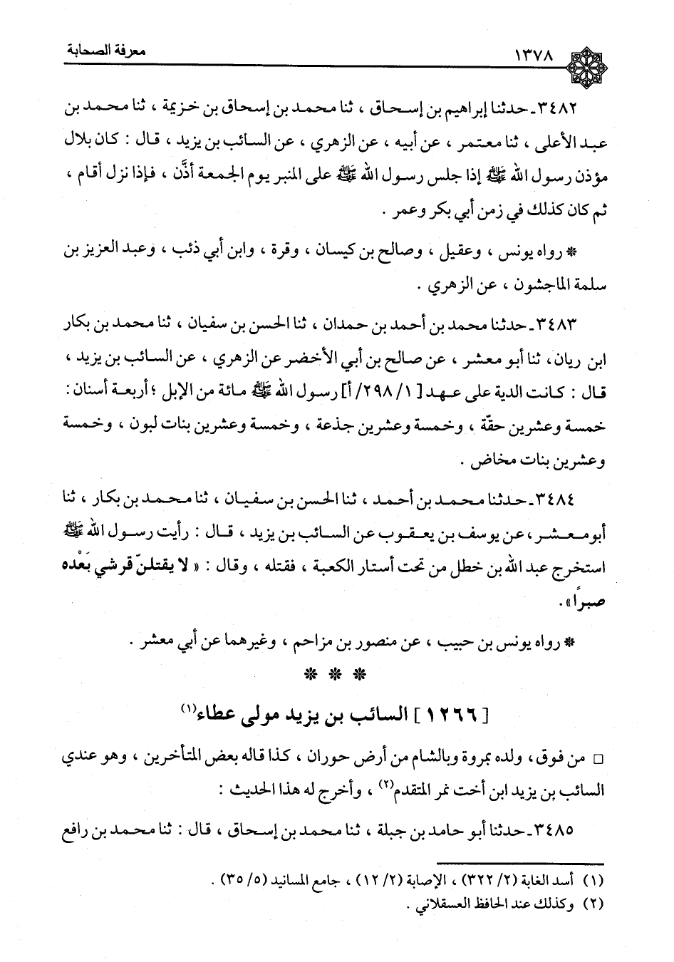٣٤٨٤ - حَدَّثَنَا مُحَمَّدُ بْنُ أَحْمَدَ، ثنا الْحَسَنُ بْنُ سُفْيَانَ، ثنا مُحَمَّدُ بْنُ بَكَّارٍ، ثنا أَبُو مَعْشَرٍ، عَنْ يُوسُفَ بْنِ يَعْقُوبَ، عَنِ السَّائِبِ بْنِ يَزِيدَ، قَالَ: رَأَيْتُ رَسُولَ اللهِ صَلَّى اللَّهُ عَلَيْهِ وَسَلَّمَ اسْتَخْرَجَ عَبْدَ اللهِ بْنَ خَطَلٍ مِنْ تَحْتِ أَسْتَارِ الْكَعْبَةِ، فَقَتَلَهُ، وَقَالَ: «لَا يُقْتَلَنَّ قُرَشِيٌّ بَعْدَهُ صَبْرًا» رَوَاهُ يُونُسُ بْنُ حَبِيبٍ، عَنْ مَنْصُورِ بْنِ مُزَاحِمٍ، وَغَيْرِهِمَا عَنْ أَبِي مَعْشَرٍ