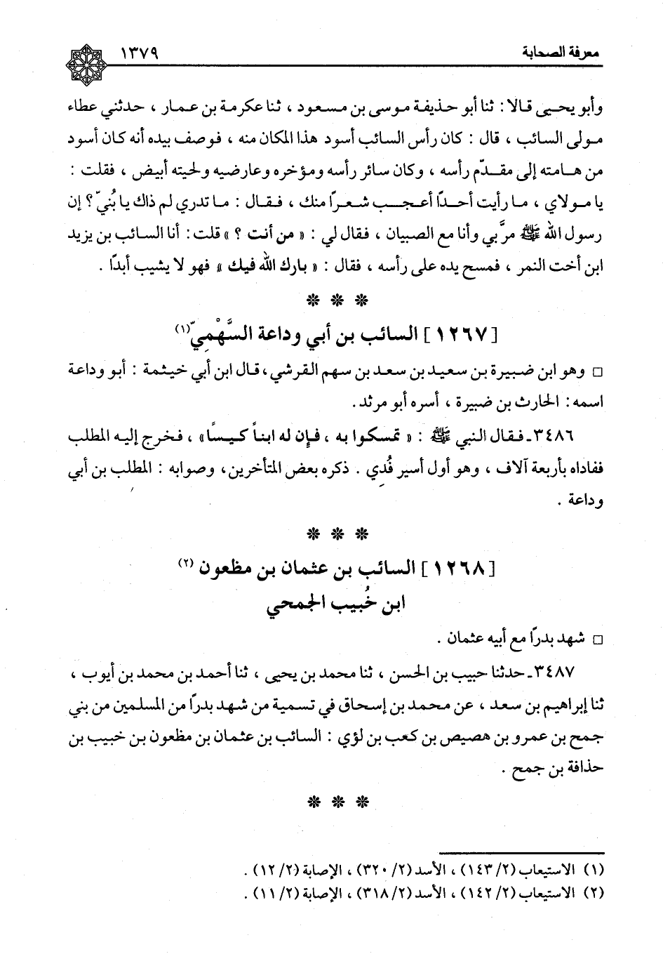 السَّائِبُ بْنُ أَبِي وَدَاعَةَ السَّهْمِيُّ وَهُوَ ابْنُ ضُبَيْرَةَ بْنِ سَعِيدِ بْنِ سَعْدِ بْنِ سَهْمٍ الْقُرَشِيُّ قَالَ ابْنُ أَبِي خَيْثَمَةَ: أَبُو وَدَاعَةَ اسْمُهُ: الْحَارِثُ بْنُ ضُبَيْرَةَ، أَسَرَهُ أَبُو مَرْثَدٍ،