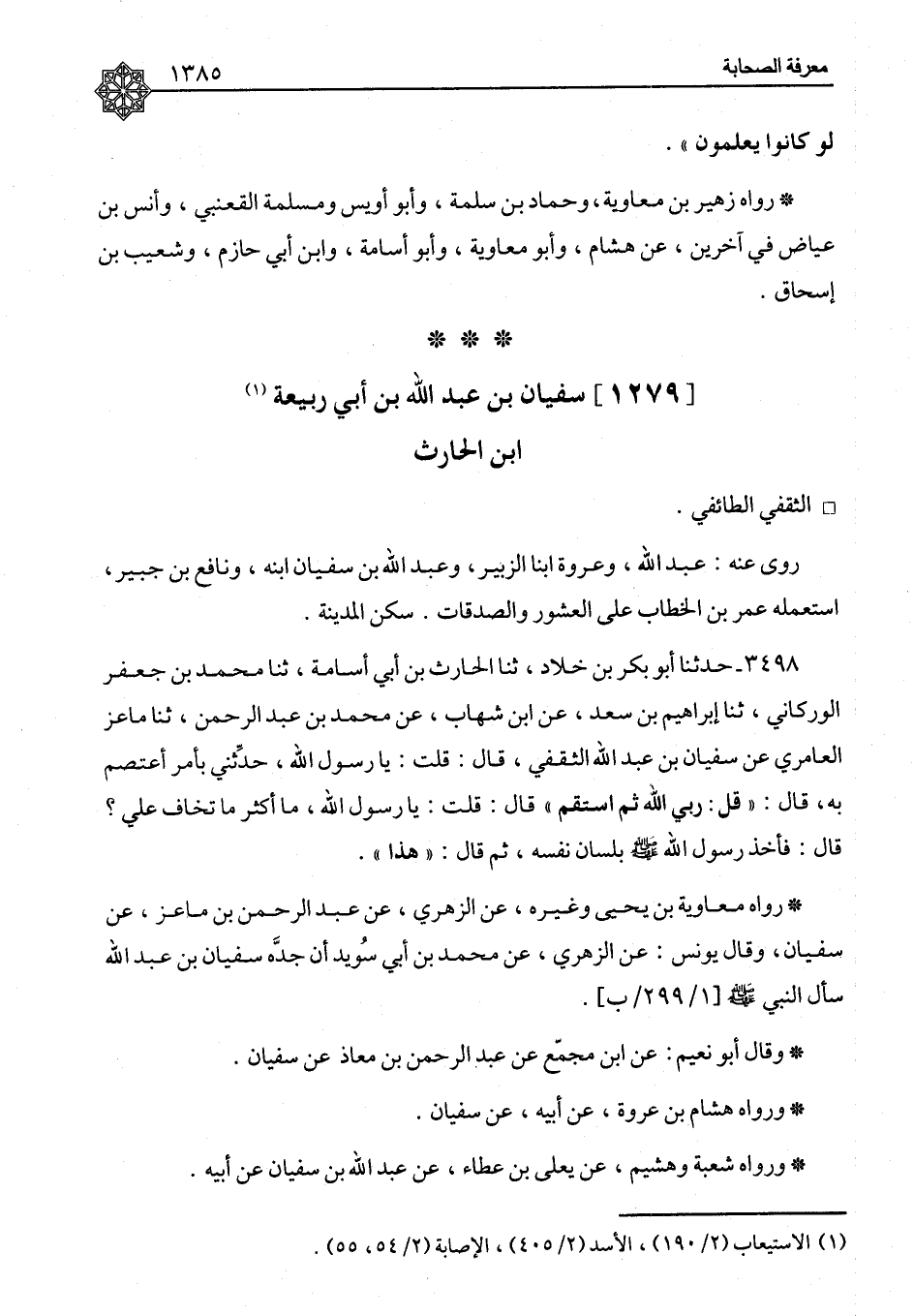 ٣٤٩٨ - حَدَّثَنَا أَبُو بَكْرِ بْنُ خَلَّادٍ، ثنا الْحَارِثُ بْنُ أَبِي أُسَامَةَ، ثنا مُحَمَّدُ بْنُ جَعْفَرٍ الْوَرَكَانِيُّ، ثنا إِبْرَاهِيمُ بْنُ سَعْدٍ، عَنِ ابْنِ شِهَابٍ، عَنْ مُحَمَّدِ بْنِ عَبْدِ الرَّحْمَنِ، ثنا مَاعِزٌ الْعَامِرِيُّ، عَنْ سُفْيَانَ بْنِ عَبْدِ اللهِ الثَّقَفِيِّ، قَالَ: قُلْتُ: يَا رَسُولَ اللهِ، حَدِّثْنِي بِأَمْرٍ أَعْتَصِمُ بِهِ، قَالَ: «قُلْ رَبِّيَ اللهُ ثُمَّ اسْتَقِمْ» قَالَ: قُلْتُ: يَا رَسُولَ اللهِ، مَا أَكْثَرَ مَا تَخَافُ عَلَيَّ؟ قَالَ: فَأَخَذَ رَسُولُ اللهِ صَلَّى اللَّهُ عَلَيْهِ وَسَلَّمَ بِلِسَانِ نَفْسِهِ، ثُمَّ قَالَ: «هَذَا» رَوَاهُ مُعَاوِيَةُ بْنُ يَحْيَى وَغَيْرُهُ، عَنِ الزُّهْرِيِّ، عَنْ عَبْدِ الرَّحْمَنِ بْنِ مَاعِزٍ، عَنْ سُفْيَانَ وَقَالَ يُونُسُ: عَنِ الزُّهْرِيِّ، عَنْ مُحَمَّدِ بْنِ أَبِي سُوَيْدٍ أَنَّ جَدَّهُ سُفْيَانَ بْنَ عَبْدِ اللهِ سَأَلَ النَّبِيَّ صَلَّى اللَّهُ عَلَيْهِ وَسَلَّمَ وَقَالَ أَبُو نُعَيْمٍ: عَنِ ابْنِ مُجَمِّعٍ عَنْ عَبْدِ الرَّحْمَنِ بْنِ مُعَاذٍ عَنْ سُفْيَانَ وَرَوَاهُ هِشَامُ بْنُ عُرْوَةَ، عَنْ أَبِيهِ، عَنْ سُفْيَانَ وَرَوَاهُ شُعْبَةُ وَهُشَيْمٌ، عَنْ يَعْلَى بْنِ عَطَاءٍ، عَنْ عَبْدِ اللهِ بْنِ سُفْيَانَ عَنْ أَبِيهِ
