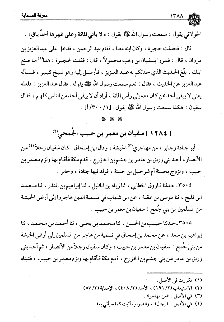 ٣٥٠٥ - حَدَّثَنَا حَبِيبُ بْنُ الْحَسَنِ، ثنا مُحَمَّدُ بْنُ يَحْيَى، ثنا أَحْمَدُ بْنُ مُحَمَّدٍ، ثنا إِبْرَاهِيمُ بْنُ سَعْدٍ، عَنْ مُحَمَّدِ بْنِ إِسْحَاقَ، فِي تَسْمِيَةِ مَنْ هَاجَرَ مِنَ الْمُسْلِمِينَ إِلَى أَرْضِ الْحَبَشَةِ مِنْ بَنِي جُمَحَ: " سُفْيَانُ بْنُ مَعْمَرِ بْنِ حَبِيبٍ، وَكَانَ سُفْيَانُ رَجُلًا مِنَ الْأَنْصَارِ، ثُمَّ أَحَدَ بَنِي زُرَيْقِ بْنِ عَامِرٍ مِنْ بَنِي جُشَمَ بْنِ الْخَزْرَجِ، قَدِمَ مَكَّةَ فَأَقَامَ بِهَا وَلَزِمَ مَعْمَرَ بْنَ حَبِيبٍ، فَتَبَنَّاهُ ⦗١٣٨٩⦘ وَزَوَّجَهُ حَسَنَةَ، وَكَانَ لَهَا شُرَحْبِيلُ مِنْ رَجُلٍ آخَرَ، وَكَانَتْ حَسَنَةُ امْرَأَةً عَدَوْلِيَّةً، وَلَاؤُهَا لِمَعْمَرٍ فَوَلَدَتْ لِسُفْيَانَ جُنَادَةَ وَجَابِرًا، فَهَدَاهُمُ اللهُ لِلْإِسْلَامِ وَأَكْرَمَهُمْ بِهِ، فَهَاجَرُوا جَمِيعًا إِلَى أَرْضِ الْحَبَشَةِ