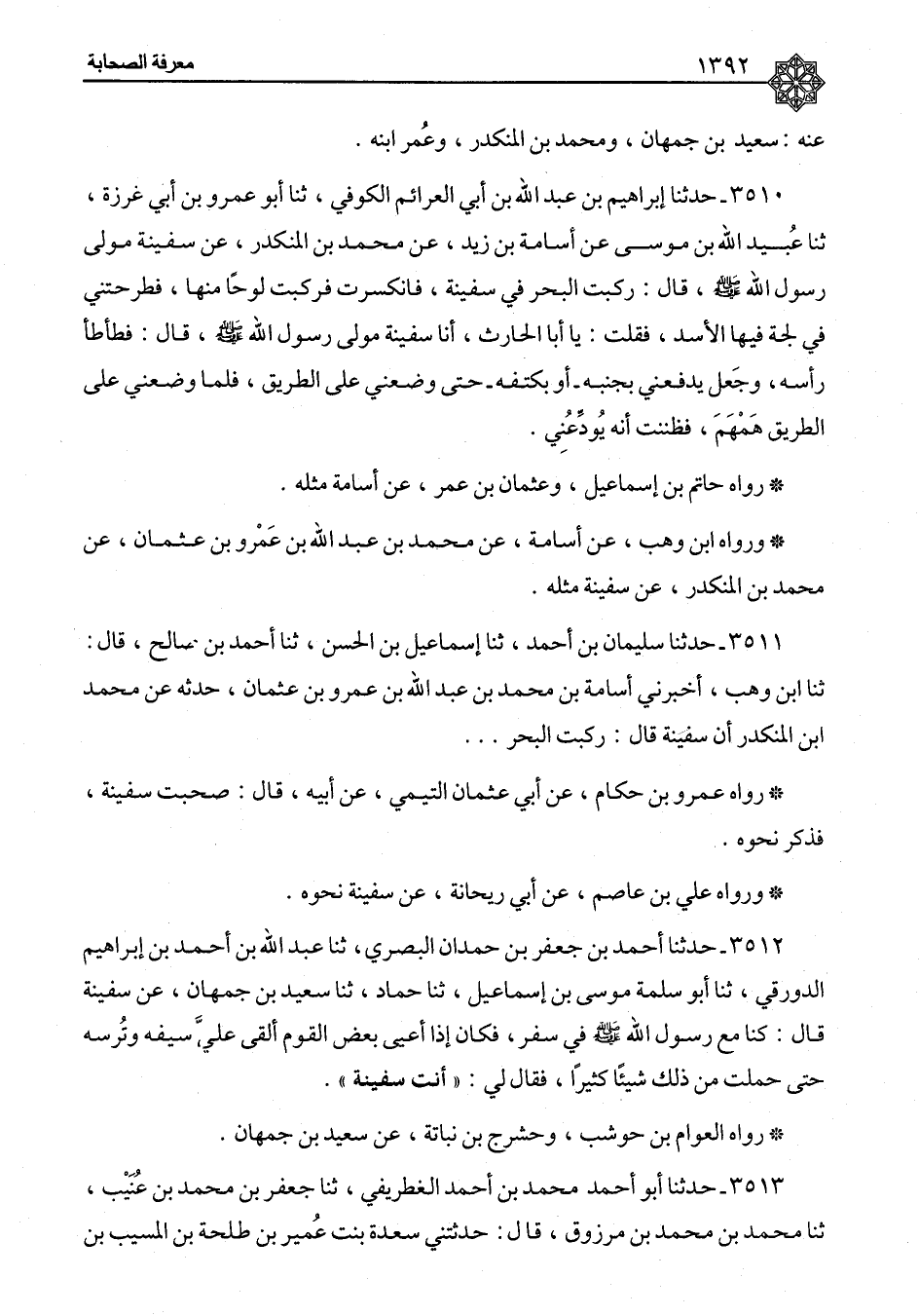 ٣٥١١ - حَدَّثَنَا سُلَيْمَانُ بْنُ أَحْمَدَ، ثنا إِسْمَاعِيلُ بْنُ الْحَسَنِ، ثنا أَحْمَدُ بْنُ صَالِحٍ، قَالَ: ثنا ابْنُ وَهْبٍ، أَخْبَرَنِي أُسَامَةُ بْنُ مُحَمَّدِ بْنِ عَبْدِ اللهِ بْنِ عَمْرِو بْنِ عُثْمَانَ، حَدَّثَهُ عَنْ مُحَمَّدِ بْنُ الْمُنْكَدِرِ، أَنَّ سَفِينَةَ، قَالَ: رَكِبْتُ الْبَحْرَ. . . . . رَوَاهُ عَمْرُو بْنُ حَكَّامٍ، عَنْ أَبِي عُثْمَانَ التَّيْمِيِّ، عَنْ أَبِيهِ، قَالَ: صَحِبْتُ سَفِينَةَ، فَذَكَرَ نَحْوَهُ، وَرَوَاهُ عَلِيُّ بْنُ عَاصِمٍ، عَنْ أَبِي رَيْحَانَةَ، عَنْ سَفِينَةَ نَحْوَهُ