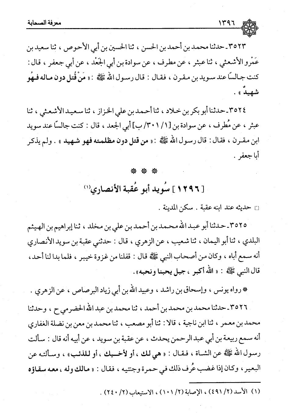 ٣٥٢٣ - حَدَّثَنَا مُحَمَّدُ بْنُ أَحْمَدَ بْنِ الْحَسَنِ، ثنا الْحُسَيْنُ بْنُ أَبِي الْأَحْوَصِ، ثنا سَعِيدُ بْنُ عَمْرٍو الْأَشْعَثِيُّ، ثنا عَبْثَرٌ، عَنْ مُطَرِّفٍ، عَنْ سَوَادَةَ بْنِ أَبِي الْجَعْدِ، عَنْ أَبِي جَعْفَرٍ، قَالَ: كُنْتُ جَالِسًا عِنْدَ سُوَيْدِ بْنِ مُقَرِّنٍ فَقَالَ: قَالَ رَسُولُ اللهِ صَلَّى اللَّهُ عَلَيْهِ وَسَلَّمَ: «مَنْ قُتِلَ دُونَ مَالِهِ فَهُوَ شَهِيدٌ»