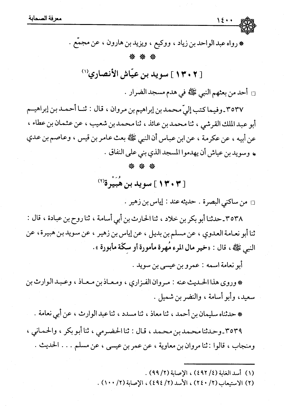 ٣٥٣٨ - حَدَّثَنَا أَبُو بَكْرِ بْنُ خَلَّادٍ، ثنا الْحَارِثُ بْنُ أَبِي أُسَامَةَ، ثنا رَوْحُ بْنُ عُبَادَةَ، قَالَ: ثنا أَبُو نَعَامَةَ الْعَدَوِيُّ، عَنْ مُسْلِمِ بْنِ بُدَيْلٍ، عَنْ إِيَاسِ بْنِ زُهَيْرٍ، عَنْ سُوَيْدِ بْنِ هُبَيْرَةَ، عَنِ النَّبِيِّ صَلَّى اللَّهُ عَلَيْهِ وَسَلَّمَ قَالَ: «خَيْرُ مَالِ الْمَرْءِ مُهْرَةٌ مَأْمُورَةٌ أَوْ سِكَّةٌ مَأْبُورَةٌ» أَبُو نَعَامَةَ اسْمُهُ: عَمْرُو بْنُ عِيسَى بْنِ سُوَيْدٍ وَرَوَى هَذَا الْحَدِيثَ عَنْهُ مَرْوَانُ الْفَزَارِيُّ، وَمُعَاذُ بْنُ مُعَاذٍ، وَعَبْدُ الْوَارِثِ بْنُ سَعِيدٍ، وَأَبُو أُسَامَةَ، وَالنَّضْرُ بْنُ شُمَيْلٍ حَدَّثَنَاهُ سُلَيْمَانُ بْنُ أَحْمَدَ، ثنا مُعَاذٌ، ثنا مُسَدَّدٌ، ثنا عَبْدُ الْوَارِثِ، عَنْ أَبِي نَعَامَةَ