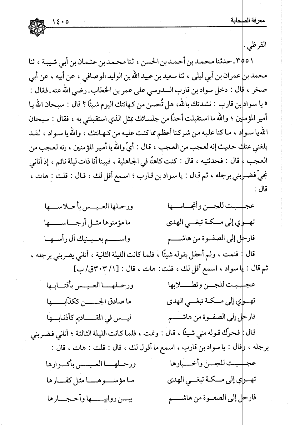 ٣٥٥١ - حَدَّثَنَا مُحَمَّدُ بْنُ أَحْمَدَ بْنِ الْحَسَنِ، ثنا مُحَمَّدُ بْنُ عُثْمَانَ بْنِ أَبِي شَيْبَةَ، ثنا مُحَمَّدُ بْنُ عِمْرَانَ بْنِ أَبِي لَيْلَى، ثنا سَعِيدُ بْنُ عُبَيْدِ اللهِ بْنِ الْوَلِيدِ الْوَصَّافِيُّ، عَنْ أَبِيهِ، عَنْ أَبِي صَخْرٍ، قَالَ: دَخَلَ سَوَادُ بْنُ قَارِبٍ السَّدُوسِيُّ عَلَى عُمَرَ بْنِ الْخَطَّابِ رَضِيَ اللهُ عَنْهُ فَقَالَ: " يَا سَوَادُ بْنَ قَارِبٍ: نَشَدْتُكَ بِاللهِ، هَلْ تُحْسِنُ مِنْ كِهَانَتِكَ الْيَوْمَ شَيْئًا؟ قَالَ: سُبْحَانَ اللهِ يَا أَمِيرَ الْمُؤْمِنِينَ، وَاللهِ مَا اسْتَقْبَلْتَ أَحَدًا مِنْ جُلَسَائِكَ بِمِثْلِ الَّذِي اسْتَقْبَلْتَنِي بِهِ، فَقَالَ: سُبْحَانَ اللهِ يَا سَوَادُ، مَا كُنَّا عَلَيْهِ مِنْ شِرْكِنَا أَعْظَمَ مِمَّا كُنْتَ عَلَيْهِ مِنْ كِهَانَتِكَ، وَاللهِ يَا سَوَادُ، لَقَدْ بَلَغَنِي عَنْكَ حَدِيثٌ إِنَّهُ لَعَجَبٌ مِنَ الْعَجَبِ قَالَ: أَيْ وَاللهِ يَا أَمِيرَ الْمُؤْمِنِينَ، إِنَّهُ لَعَجَبٌ مِنَ الْعَجَبِ قَالَ: فَحَدِّثْنِيهِ قَالَ: كُنْتُ كَاهِنًا فِي الْجَاهِلِيَّةِ، فَبَيْنَا أَنَا ذَاتَ لَيْلَةٍ نَائِمٌ، إِذْ أَتَانِي نَجِيٌّ فَضَرَبَنِي بِرِجْلِهِ، ثُمَّ قَالَ: يَا سَوَادُ بْنَ قَارِبٍ، اسْمَعْ أَقُلْ لَكَ قَالَ: قُلْتُ: هَاتِ قَالَ:
