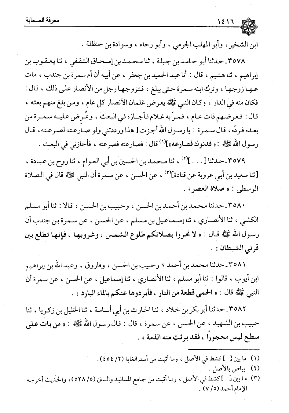 ٣٥٨٠ - حَدَّثَنَا مُحَمَّدُ بْنُ أَحْمَدَ بْنِ الْحَسَنِ، وَحَبِيبُ بْنُ الْحَسَنِ، قَالَا: ثنا أَبُو مُسْلِمٍ الْكَشِّيُّ، ثنا الْأَنْصَارِيُّ، ثنا إِسْمَاعِيلُ بْنُ مُسْلِمٍ، عَنِ الْحَسَنِ، عَنْ سَمُرَةَ بْنِ جُنْدُبٍ، أَنَّ رَسُولَ اللهِ صَلَّى اللَّهُ عَلَيْهِ وَسَلَّمَ قَالَ: «لَا تَحَرَّوْا بِصَلَاتِكُمْ طُلُوعَ الشَّمْسِ، وَغُرُوبَهَا، فَإِنَّهَا تَطْلُعُ بَيْنَ قَرْنَيِ الشَّيْطَانِ»